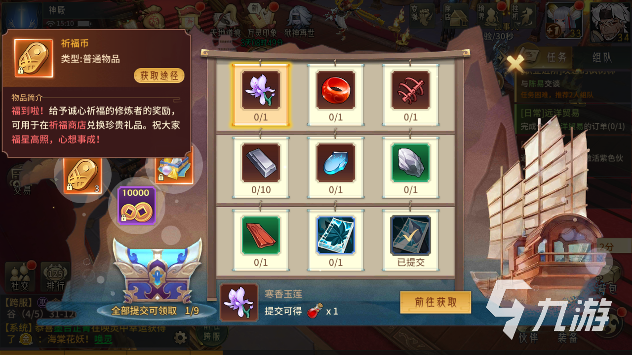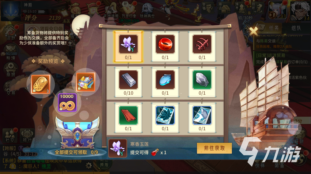 這個(gè)貨物的數(shù)量還是很多的,總共有九種貨物需要玩家來籌備的。貨物的類型也是很多種類的,包含有材料、道具以及技能書等。在材料的上方會(huì)有一個(gè)數(shù)字的顯示,如果說玩家背包里面有當(dāng)前材料的話可以直接點(diǎn)擊提交來完成該貨物的籌備。如果說沒有這個(gè)道具的話那么就是選擇前往獲取,不同的道具在獲取方式上是有一些區(qū)別的。