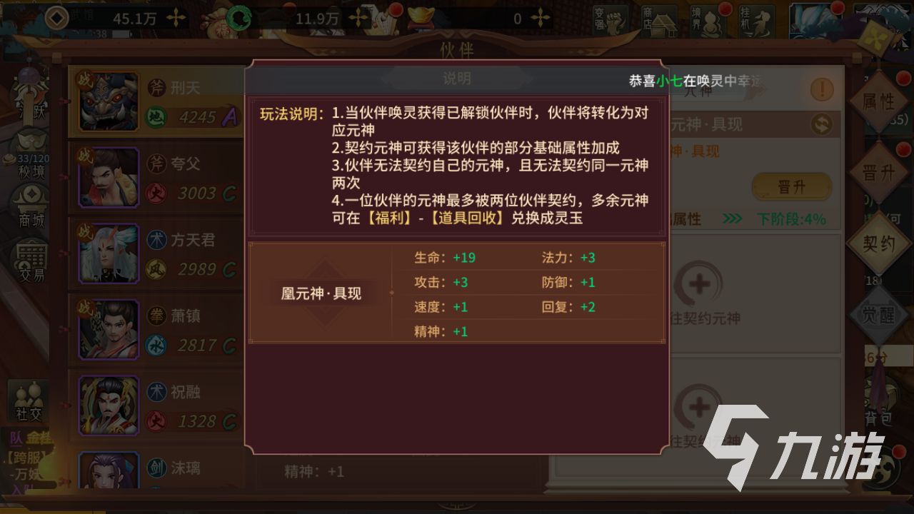 再來介紹一些機制,在契約玩法中玩家伙伴本體和伙伴元神在契約之后獲得屬性的提升。但是同一個元神的話只可以被契約兩次,也就是被兩個伙伴給契約獲得屬性。契約伙伴元神的時候,可以獲得對應(yīng)伙伴百分比的屬性能力提升。這個能力的提升是百分比加成的, 對于實力還是有不錯幫助的。