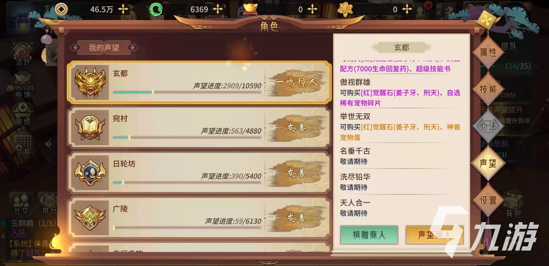 第二個獲取的方法就是我們的聲望商店啦,在聲望商店里你可以獲得很多你想到的東西,比如像我們的藥品藥材、覺醒石、人物碎片,神獸寵物蛋等一些珍貴材料,聲望商店也是按等級劃分的,等級越高,可以去的商店也就越多,在這里小編要提醒一下玩家們,聲望商店是需要我們做任務(wù)獲得的聲望值來進(jìn)行采買的,你的聲望值越多,可以買的種類也就越豐富,所以玩家們還是要多多做任務(wù)哦。