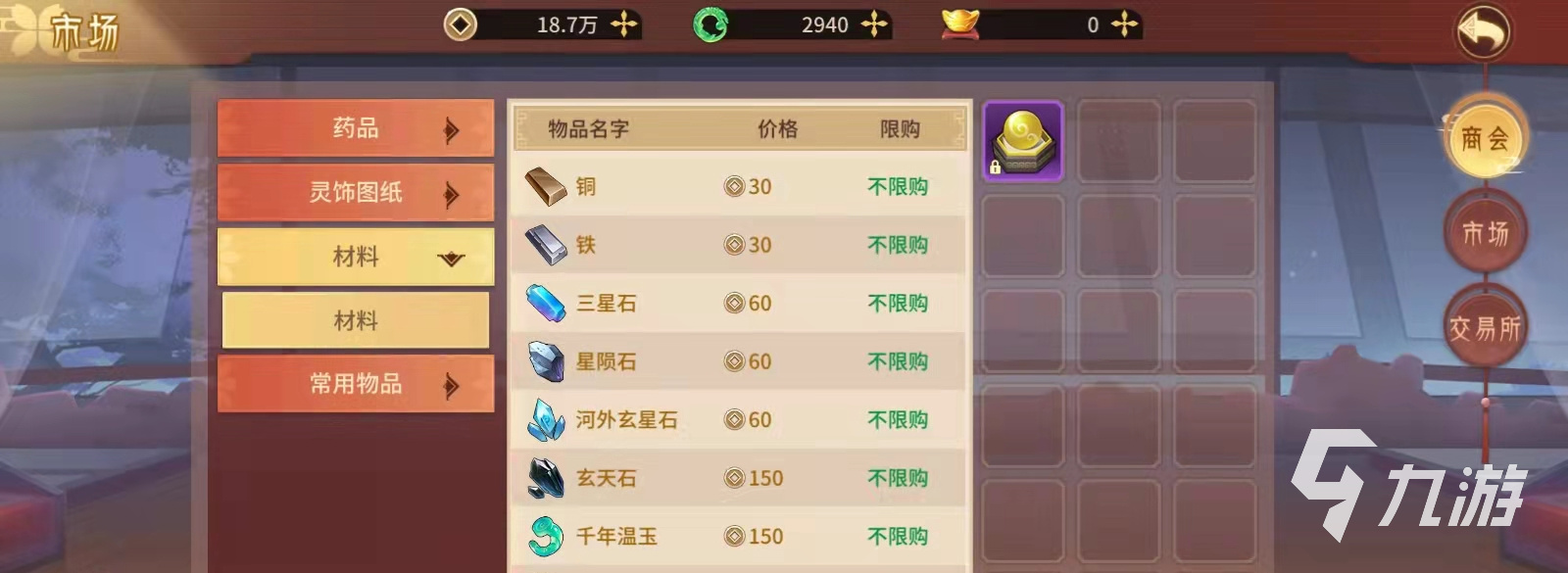 第二種獲取途徑請前往市場,找到材料板塊進(jìn)入,這里每天都會更新所要用的材料,玩家們蹲一蹲,興許能遇到硬質(zhì)資源石,第三種獲取途徑請玩家前往玉虛境1至1里面進(jìn)行獲取,前提是要求小伙伴達(dá)到34級才可以開啟,沒達(dá)到的玩家努努力吧。
