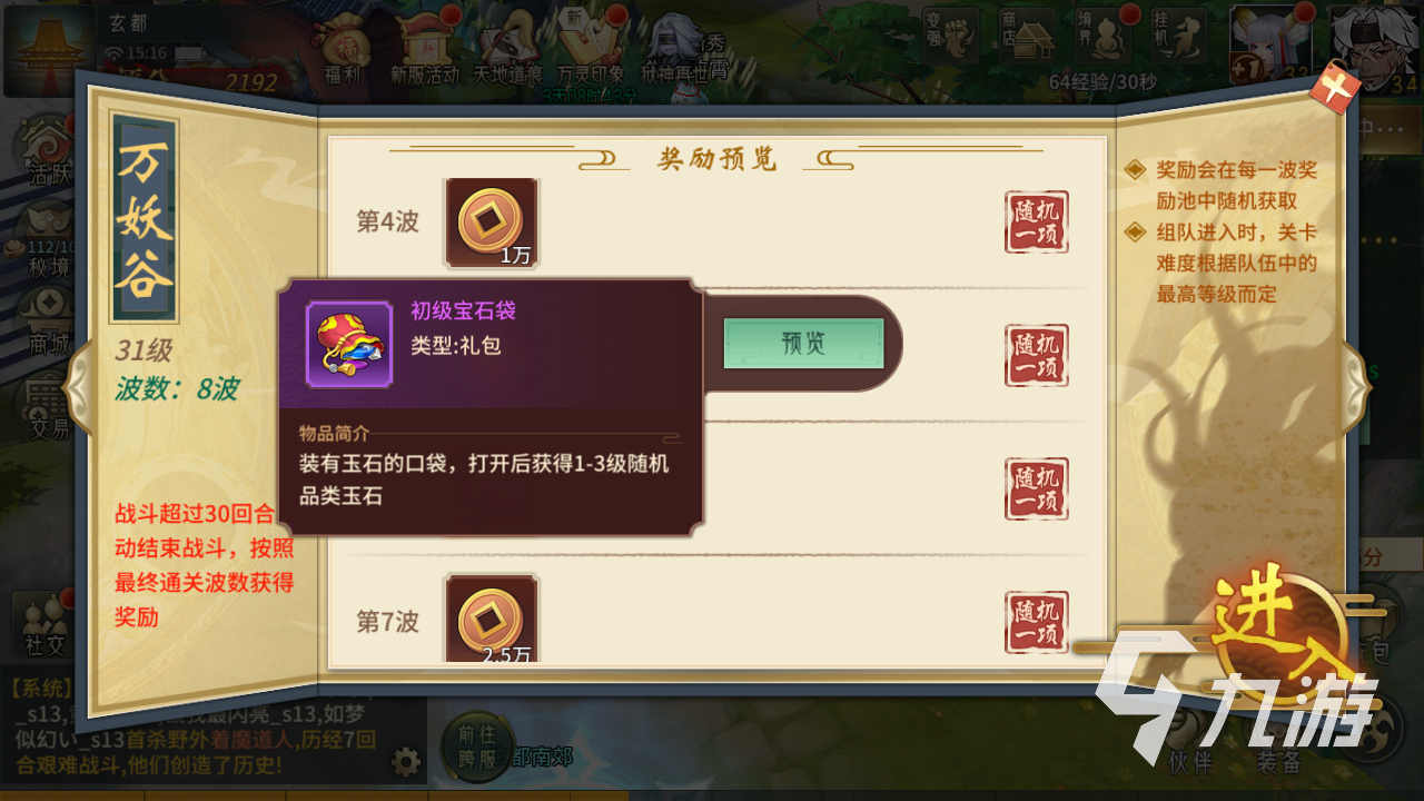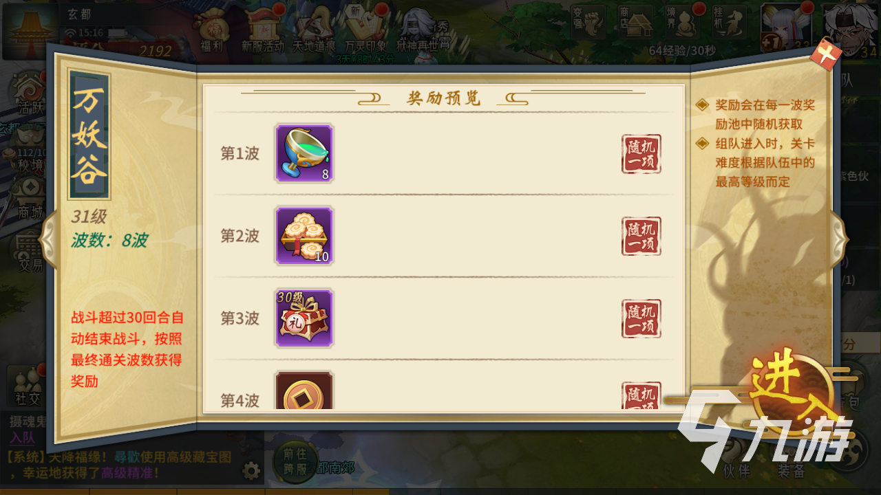 再來(lái)介紹一下玩法機(jī)制,這個(gè)挑戰(zhàn)類型的玩法就不用玩家到處跑去找怪物了。只要進(jìn)入到戰(zhàn)斗之后,那么就會(huì)一直戰(zhàn)斗到玩法結(jié)束。在萬(wàn)妖谷的挑戰(zhàn)中,總共是有三十波的敵人要戰(zhàn)勝的,每五波一個(gè)小型的精英敵人,十波一個(gè)BOSS級(jí)別的敵人。普通的敵人基本上就是一輪技能就帶走了,而精英和BOSS的話就要注意打法了,也是有一些特殊設(shè)定的。