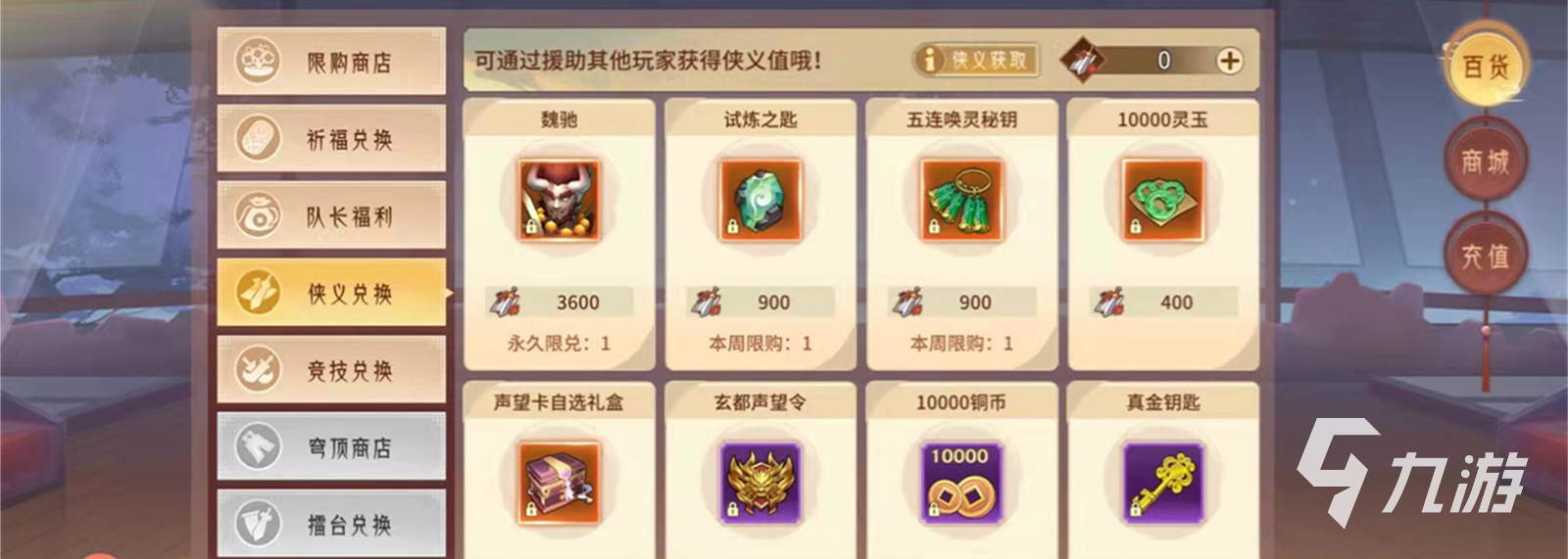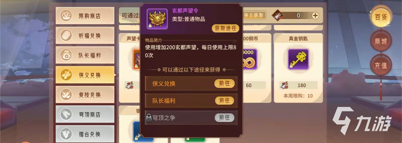 玩家只需要用隊(duì)長工資道具來進(jìn)行購買玄都聲望令,玄都聲望令需要500個(gè)隊(duì)長工資道具購買,沒有任何標(biāo)記的限購次數(shù),大家可放心購買,第二種獲取途徑玩家可前往主界面左下方的俠義兌換中進(jìn)行獲取玄都聲望令,在俠義兌換中玩家需要用俠義值來購買所需要的道具,要求玩家用60個(gè)俠義值來購買聲望令,也是沒有要求限購次數(shù)。