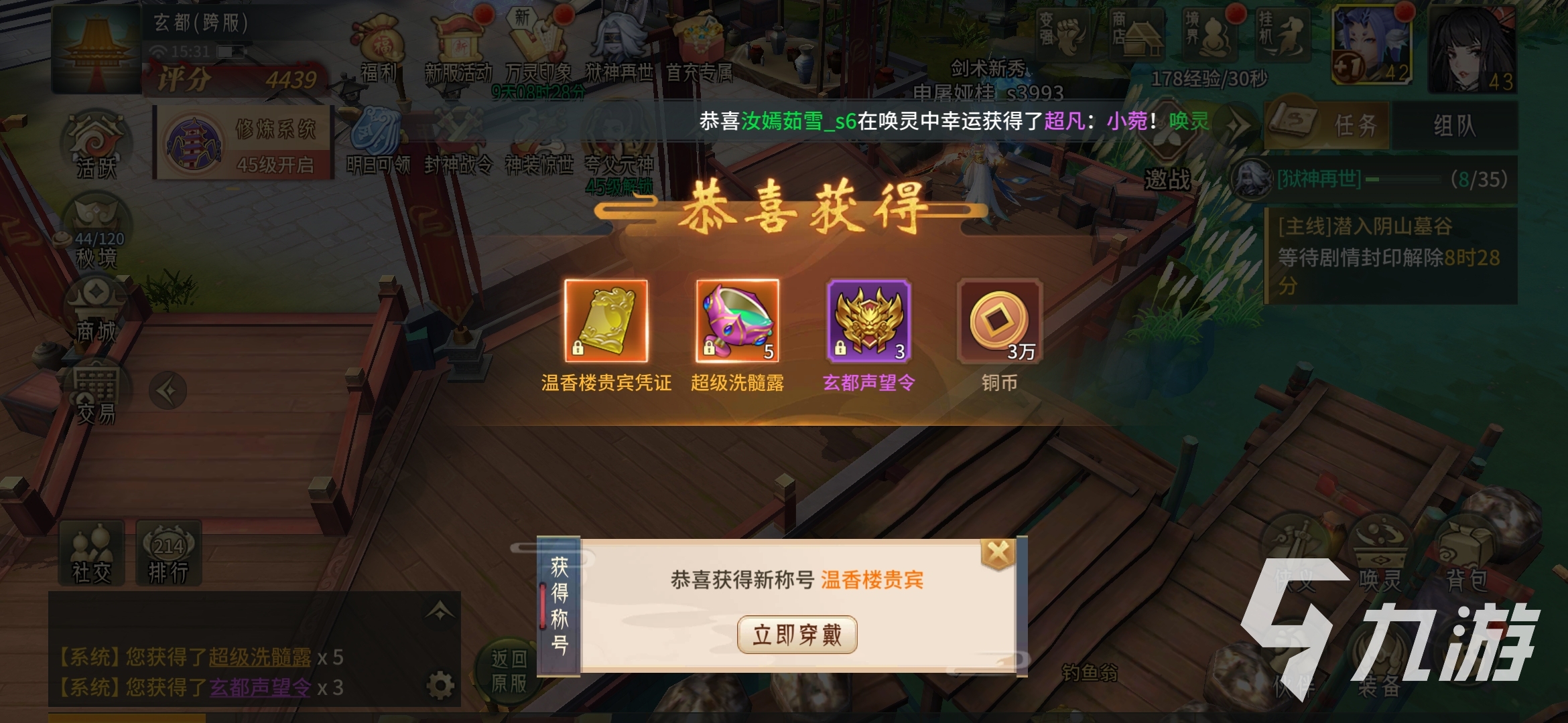 我們選擇兇手提交任務(wù)后,猜對(duì)的話(huà),會(huì)直接獲得任務(wù)獎(jiǎng)勵(lì),有溫香樓貴賓稱(chēng)號(hào)、超級(jí)洗髓露、玄都聲望令和銅幣。點(diǎn)擊立即穿戴即可。