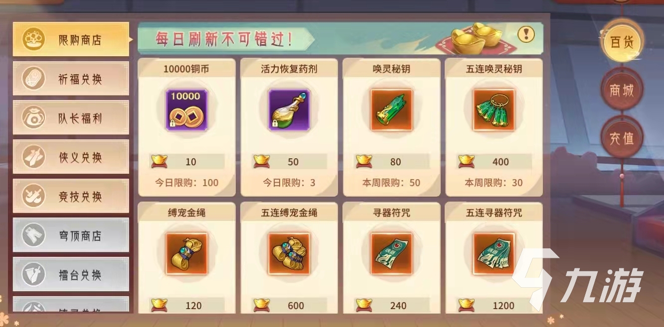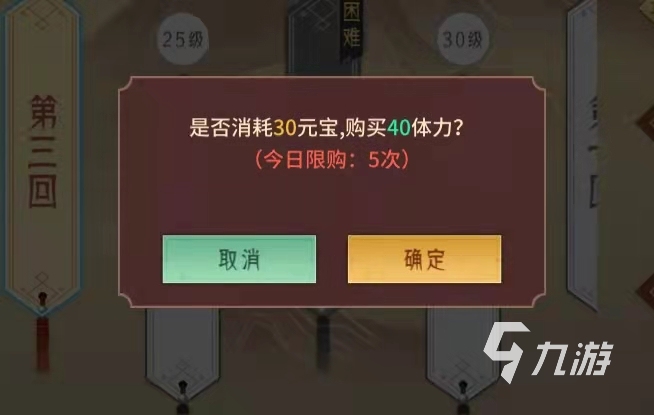 第二種方法是通過(guò)元寶恢復(fù)體力,當(dāng)玩家體力不足時(shí),可以在游戲的正上方點(diǎn)擊體力,后面會(huì)有一個(gè)加號(hào),消耗30個(gè)元寶可以購(gòu)買40點(diǎn)體力,每日最多可以購(gòu)買5次,元寶可以通過(guò)做任務(wù)獲取,也可以通過(guò)充值獲取。