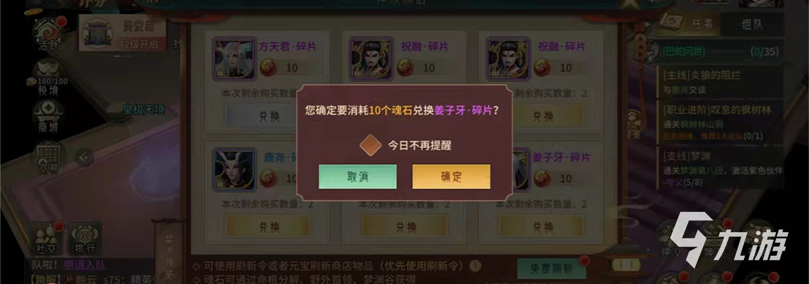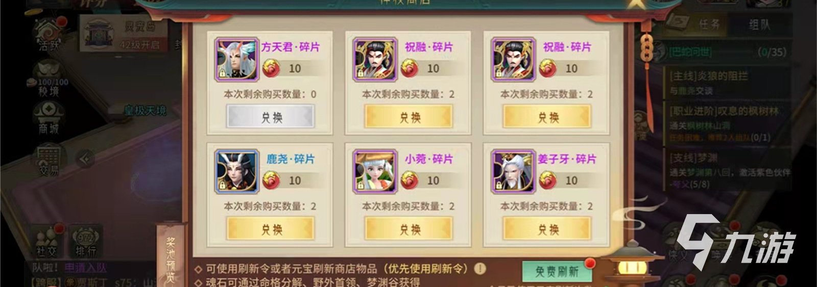 第二種獲取途徑,玩家可點擊右上方的商城進入,在神秘商城界面里就有玩家所需要購買的姜子牙碎片了,玩家需要用魂石來進行獲取姜子牙碎片,10個魂石可以購買1次,本次剩余次數(shù)只有2次,超過次數(shù)的玩家可點擊刷新重新購買即可,但一定要魂石充足呦,可以使用元寶刷新商店物品,魂石可通過命格分解,野外首領(lǐng)以及夢淵谷中進行獲得。
