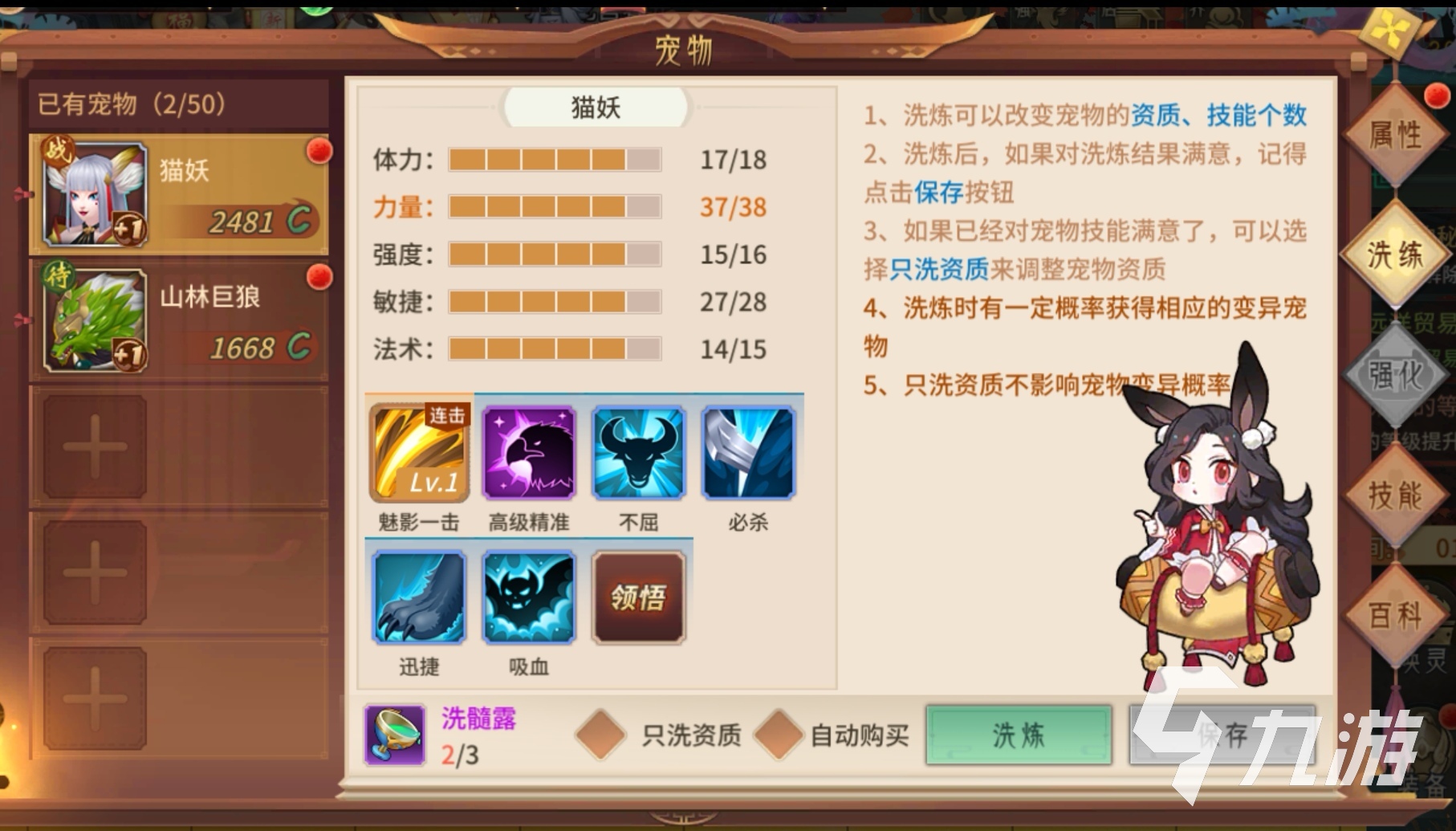 洗練可以改變寵物的資質(zhì)與技能個(gè)數(shù),屬于間接的提升寵物戰(zhàn)力,并且這也是個(gè)隨機(jī)的方法,不是每次都能提升的,玩家可以多試幾次,等到了滿意的程度時(shí)保存即可。