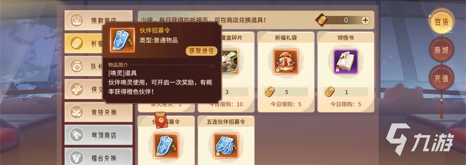 在萬靈山海之境中招募令的獲取方式目前有以下幾種,第一種獲取途徑請(qǐng)玩家前往商城功能,點(diǎn)擊右邊的百貨按鈕,找到祈福兌換,在這里面就可以購買到招募令道具,玩家需要用祈福幣來進(jìn)行兌換。