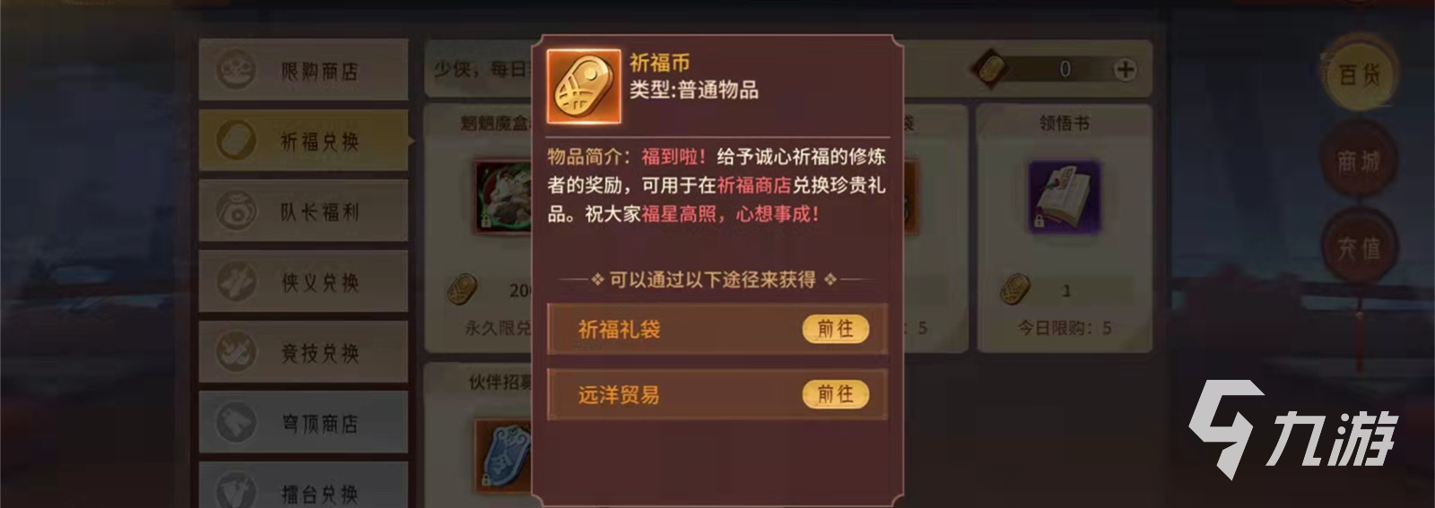 3個(gè)祈福幣可兌換3個(gè)招募令,也可以選擇五連伙伴招募令,只需要15個(gè)祈福幣就可以購買,祈福幣如果沒有,玩家可以通過祈福禮袋或者遠(yuǎn)洋貿(mào)易里面進(jìn)行獲取,就可以領(lǐng)取招募令。
