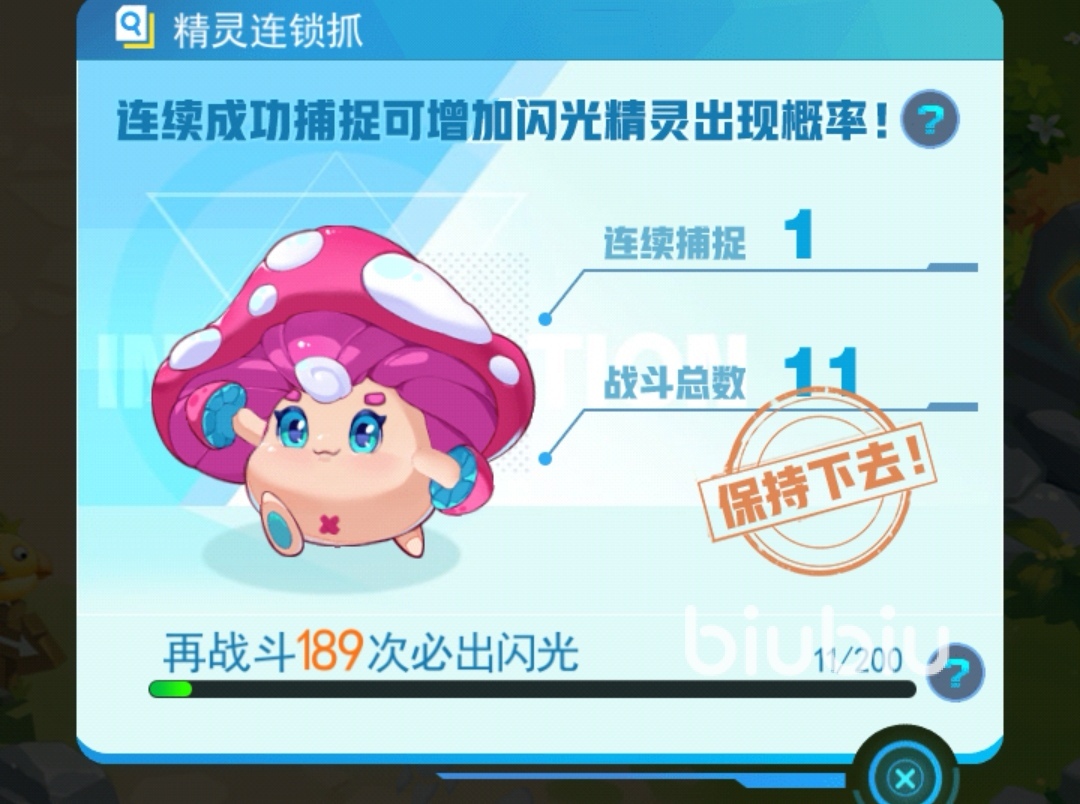 其實(shí)如果玩家運(yùn)氣好的話,可能只要抓個(gè)40次菇寶寶或者打個(gè)40次菇寶寶就可以將閃光菇寶寶刷出來了,不過由于閃光菇寶寶的等級(jí)太低,所以建議玩家?guī)б粋€(gè)10級(jí)左右的精靈,這樣方便把閃光菇寶寶打到殘血,然后保險(xiǎn)起見使用高級(jí)電池把它抓捕起來。