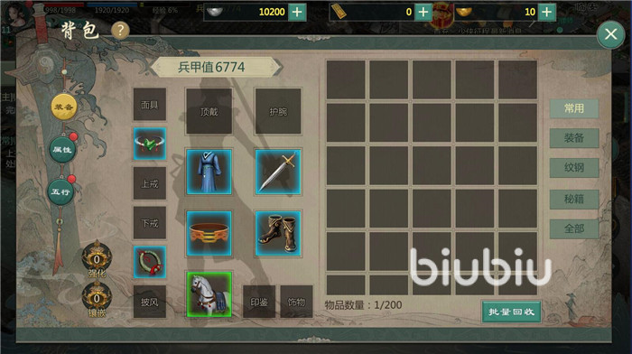 游戲中每個(gè)角色共可以佩戴十件裝備,每件裝備由固定詞條和隨機(jī)詞條組成,玩家可以對(duì)裝備進(jìn)行升級(jí)、鑲嵌紋鋼、雕刻玄鐵或月石、鑲嵌魂器幾種方式來(lái)進(jìn)行強(qiáng)化增加裝備屬性。如果你更換新的裝備不用重新強(qiáng)化,原來(lái)的強(qiáng)化數(shù)據(jù)可以直接加在角色上。