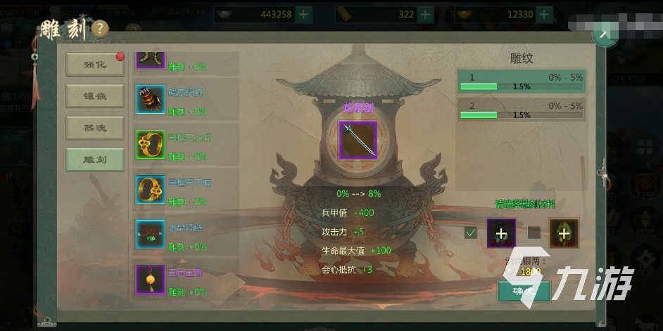 雕刻這個(gè)玩法也是基于裝備的,同樣的要進(jìn)入到裝備的強(qiáng)化界面,在右側(cè)選擇雕刻就可以了。在右側(cè)就是裝備的選擇,左側(cè)就是雕刻的操作界面。在選擇一個(gè)裝備之后,點(diǎn)擊右下角的確定按鈕就可以完成雕刻操作了。消耗的貨幣是銀兩,而雕刻道具是有兩個(gè)分類的。