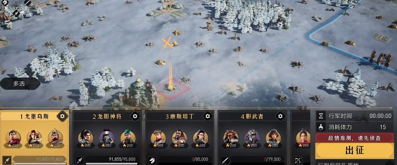 想要攻擊周邊城池的話首先要派偵察兵偵查一下敵方主要部隊(duì)和主將,然后派遣相應(yīng)克制關(guān)系的陣容隊(duì)伍,當(dāng)然也要檢查一下對(duì)方的兵力。點(diǎn)擊地圖上城池周邊紅色的地盤,然后點(diǎn)擊攻占,就可以進(jìn)入派遣隊(duì)伍界面。