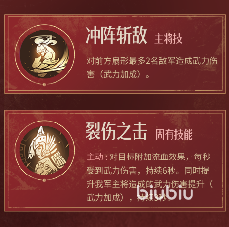 而被動技能裂傷之擊,會有25%幾率給目標帶來6秒的流血效果,并且略微提高我方主將武力加成持續(xù)3秒。你可以搭配帶有適合玩出血流的高武力陣容,小編建議配合騎士王,騎士王的主動技可以大幅提高武力值并且自身也有高額傷害,非常適合組合成一堆,配上流血和武力buff疊加,另外再加騎士王無視防御的祝福,可以說是秒天秒地秒空氣了。