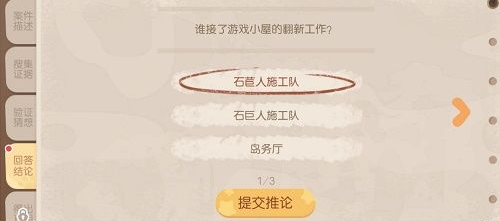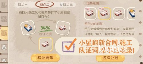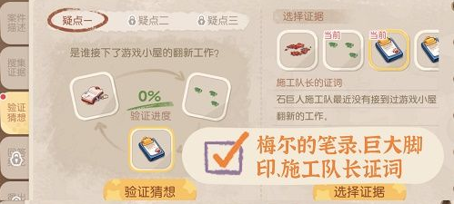 第1個(gè)疑點(diǎn)是接下游戲小屋翻新工作的是誰,找到的答案是梅爾的筆錄、施工隊(duì)長(zhǎng)的證詞和巨大的腳印。第2個(gè)疑點(diǎn)是石苣人施工隊(duì)和梅爾簽訂了翻新合同嗎,找到的答案是小屋翻新合同,希爾達(dá)的第1份筆錄和施工隊(duì)的證詞。