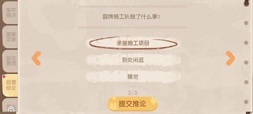 這里需要注意的是施工隊(duì)的證詞和施工隊(duì)長(zhǎng)的證詞不是同一個(gè)道具,在選擇的時(shí)候一定要看清楚。第3個(gè)疑點(diǎn)是哪支施工隊(duì)被頻繁投訴,找到的答案是施工隊(duì)隊(duì)長(zhǎng)的證詞,室內(nèi)裝修合同和庭院擴(kuò)建合同。