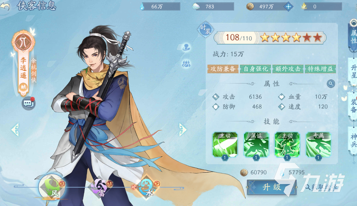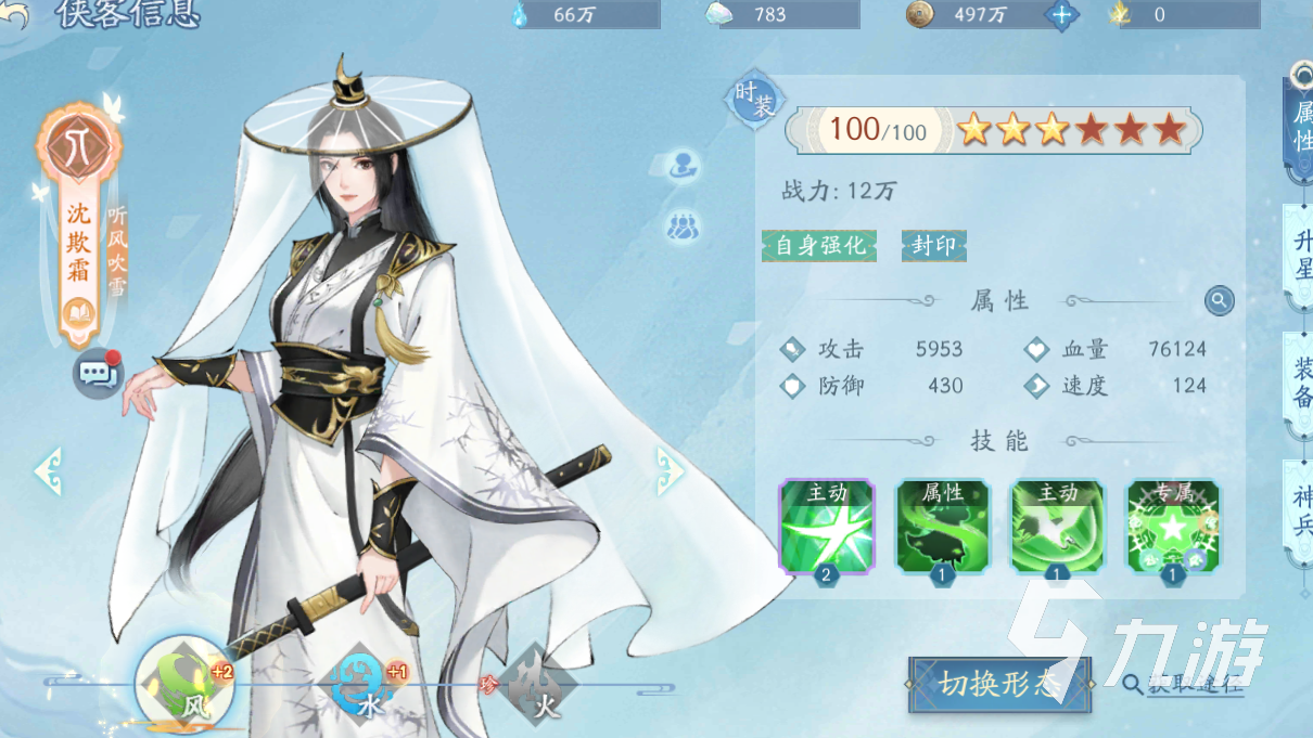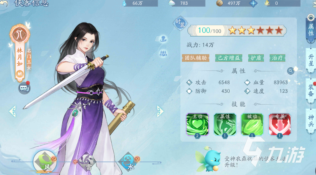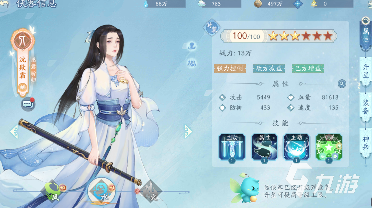 第二個(gè)推薦的是沈欺霜,沈欺霜的話屬性有兩個(gè)選擇,一個(gè)就是風(fēng)屬性了,風(fēng)屬性的沈欺霜擁有不錯(cuò)的輸出能力以及封印能力。技能在輸出的同時(shí)可以封印目標(biāo), 讓敵人無(wú)法使用任何的技能。而水屬性的沈欺霜可以帶來(lái)不錯(cuò)的恢復(fù)以及攻擊力的提升,主動(dòng)技能可以帶來(lái)大幅度的血量恢復(fù)。專屬技能可以為風(fēng)雷火屬性的俠客提升攻擊力,對(duì)應(yīng)的屬性越多,提升也就越大。