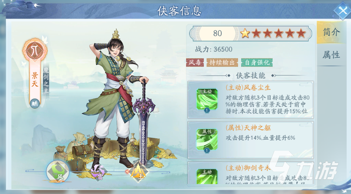 景天這個(gè)俠客是一個(gè)橙色珍稀級(jí)別的俠客,獲取的難度是相對(duì)較高的。在基礎(chǔ)的屬性上是一個(gè)風(fēng)屬性的設(shè)定,風(fēng)屬性的景天定位是輸出,擁有不錯(cuò)的風(fēng)毒能力以及自身強(qiáng)化的能力。那么既然是一個(gè)風(fēng)屬性的俠客,隊(duì)伍方面就要風(fēng)屬性為主了。