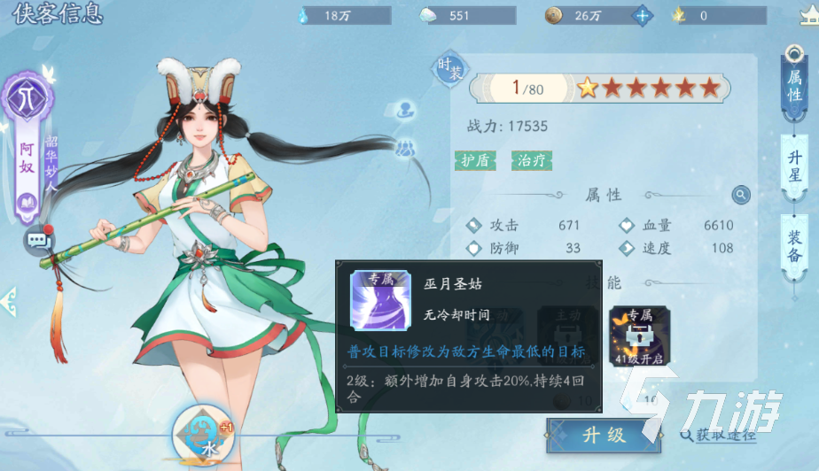 繼續(xù)來看一看阿奴的技能設定,主動技能“漱玉訣”,該技能使用之后可以為血量最低的一個單位套上護盾,護盾的厚度是阿奴自身攻擊150%的設定。當技能到了滿級之后,還會帶來目標100%攻擊力血量的恢復效果。這個技能的輔助能力比較不錯,護盾是受到阿奴的影響,而恢復效果是受益目標的攻擊力影響。這個對于輸出類型的俠客來說是很好的設定,可以恢復很多血。