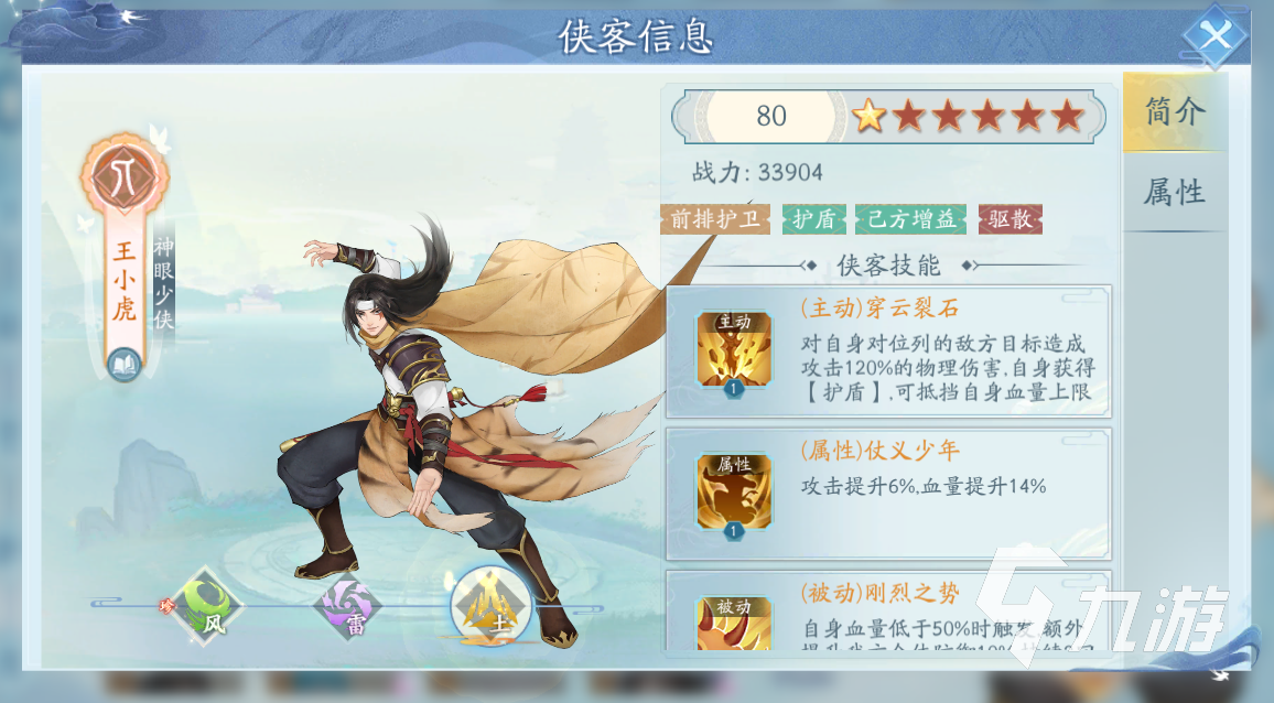 再來就是前排的俠客了,前排俠客的話一定是要能抗才行。一般來說土屬性的俠客都是帶有一些防御能力提升的,比如說王小虎可以獲得護盾的增益,能夠吸收大量的傷害。在基礎(chǔ)的防御上也是比較高的,適合當做前排來使用。前排的數(shù)量是一個到兩個左右適合,看情況來決定。