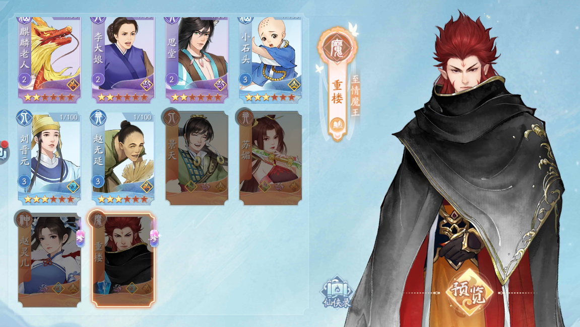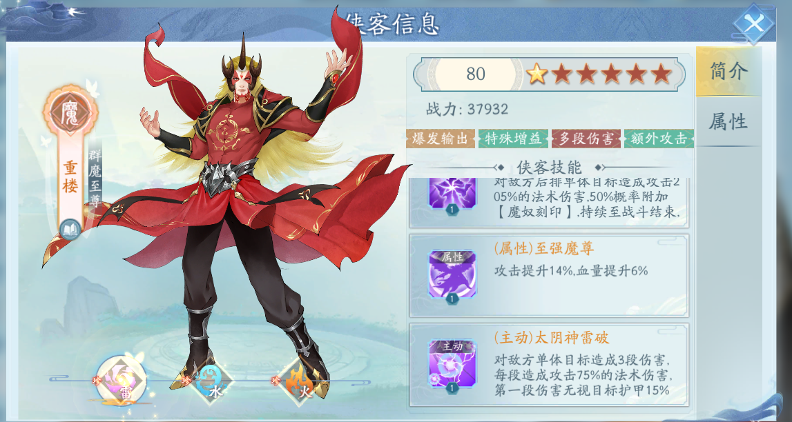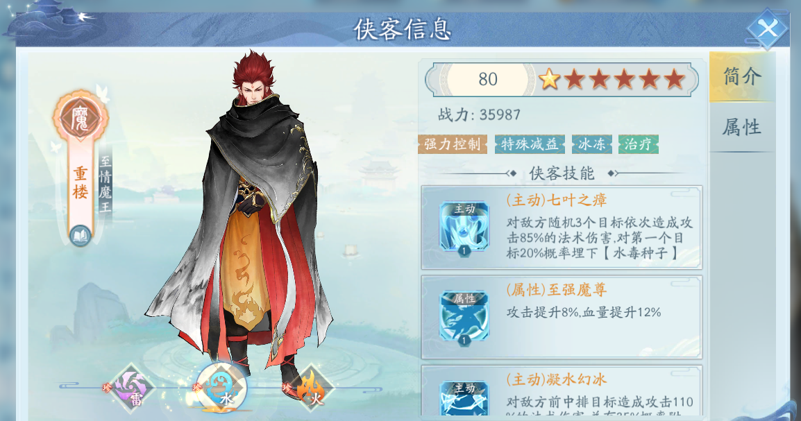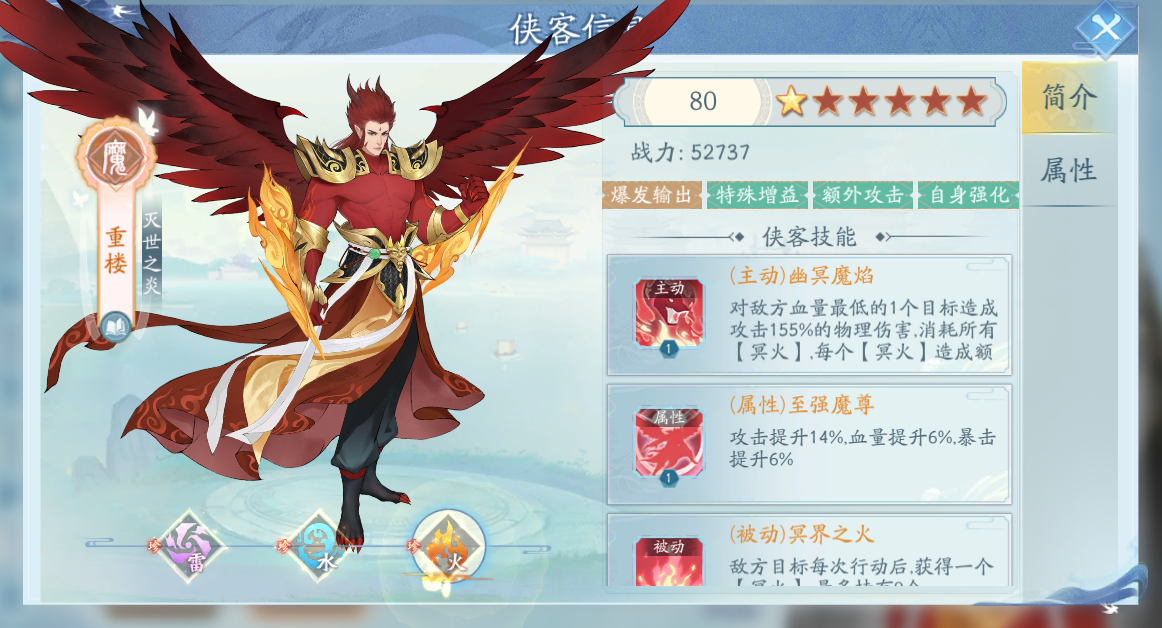 重樓是屬于橙色珍稀俠客的一個設(shè)定,在獲取的難度上會有一點高,所以說很多玩家都還沒入手到。在屬性上重樓是有雷水火這三個設(shè)定的,能力方面也是有一定禪意的。