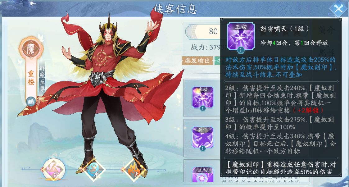 先來看一看雷屬性的重樓,這個屬性的重樓定位是爆發(fā)輸出、增益以及多段傷害的設(shè)定。那么既然是輸出,輸出的能力如何就是判斷強度的核心。在技能上主動技能“怒雷嘯天”會優(yōu)先攻擊敵人的后排,造成百分比法術(shù)傷害,同時會有幾率附加一個刻印。這個刻印存在時間是無限制的,直到戰(zhàn)斗結(jié)束位置。重樓的任意攻擊帶有刻印目標,會造成額外的50%輸出,還是很強的。