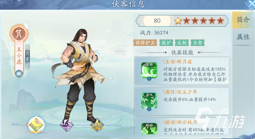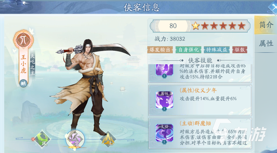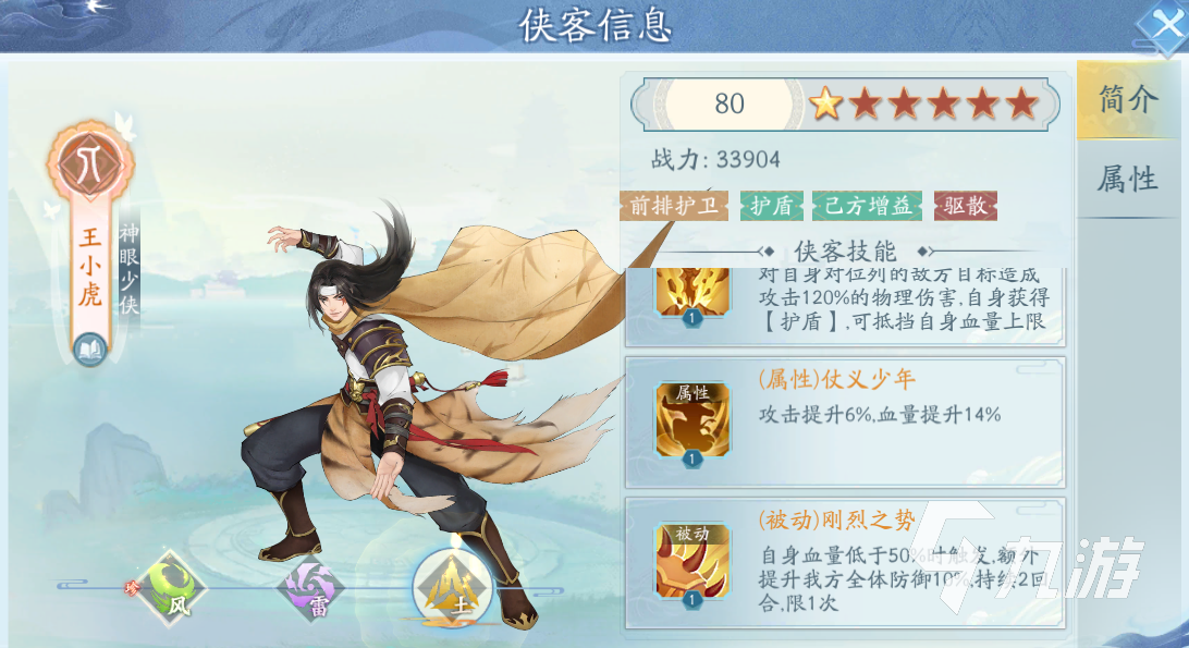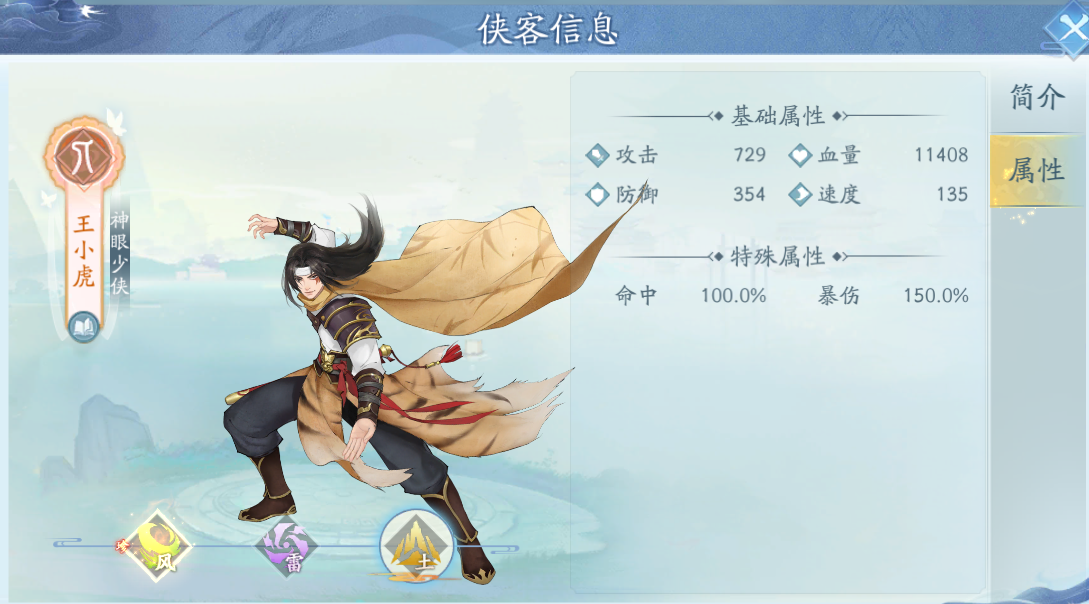 王小虎這個(gè)俠客在品級(jí)上也是珍稀的五星俠客,這個(gè)品級(jí)是目前最高的,所以在基礎(chǔ)能力上是比較不錯(cuò)的。在陣營(yíng)上是人族的,這個(gè)大家都比較了解。在屬性上是有風(fēng)雷土這三個(gè)屬性的,三個(gè)屬性在玩法設(shè)定上有一定的差異。