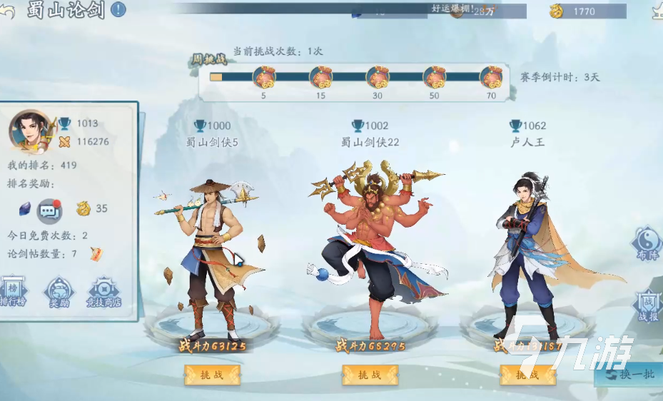 蜀山論劍這個(gè)玩法就是玩家之間的對戰(zhàn)玩,在進(jìn)入到挑戰(zhàn)的界面之后,可以看到中間部分有三個(gè)對手可以選擇。在對手的頭頂可以看到排名,同時(shí)在下方可以看到對手防守陣容的戰(zhàn)斗力是多少。如果說戰(zhàn)斗力比自身要低的話,可以直接點(diǎn)擊挑戰(zhàn)來進(jìn)行戰(zhàn)斗,勝利還是相對輕松的。