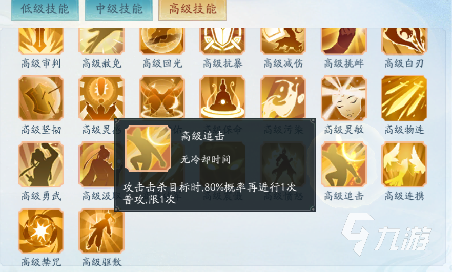 第三個(gè)推薦的是“高級(jí)追擊”,這個(gè)技能需要擊殺目標(biāo)之后才會(huì)觸發(fā)。敵人單位在陣亡之后有80%的概率再進(jìn)行一次普攻,一個(gè)回合限定一次。這個(gè)技能適合普攻俠客攜帶,效果不錯(cuò)。