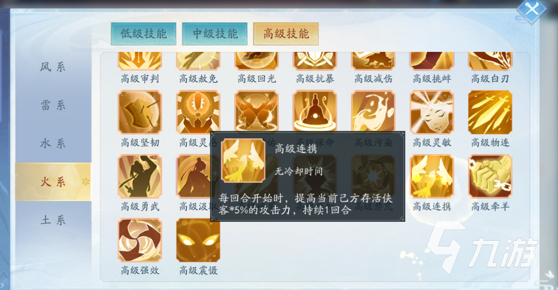 第三個推薦的是“高級連攜”,這個技能綜合的收益是非常高的。在每個回合開始的時候,會提升當(dāng)前存活俠客數(shù)量乘以5%的攻擊力。這個效果收益是整體的一個收益,所有存活的俠客都是可以吃到這個加成的,效果持續(xù)為一個回合。但是每個回合又會開始重新計算,所以說算是一個永久的加成。