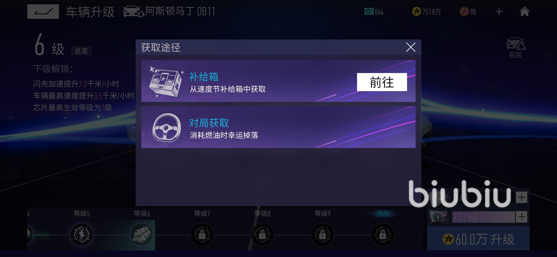 當(dāng)車輛升級到6級之后,想要再次升級的話除了零件、金幣之外我們還要消耗車輛專屬的阿斯頓馬丁db11藍(lán)圖了。藍(lán)圖的獲取途徑主要有跑圖隨機(jī)獲得、速度節(jié)寶箱抽獎、心愿4s店購買、消耗燃油掉落等,作為史詩車輛大家只要多對局藍(lán)圖也是很容易得到的。