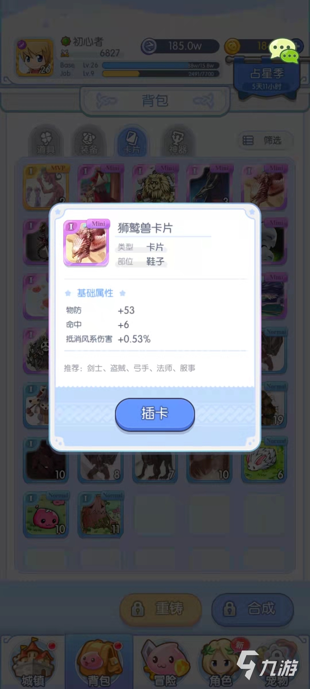 想要合理搭配上卡片,除了自己熟悉了之后進(jìn)行挑選外,還可以使用一件插卡的功能,在主線地圖通關(guān)獸人村落40之后,在伙伴界面就可以使用一件插卡功能了。同時(shí)這些卡片還可以升級(jí),同名的卡片在一起就可以升級(jí)為更高級(jí)的卡片,打開(kāi)背包界面,在其中找到卡片背包,其中就有重鑄和合成功能,重鑄指的是重新生成卡片的一些附加屬性,使得更適合伙伴的職業(yè)特點(diǎn),合成就是低級(jí)卡片和合成為高級(jí)卡片,屬性大幅度提升。