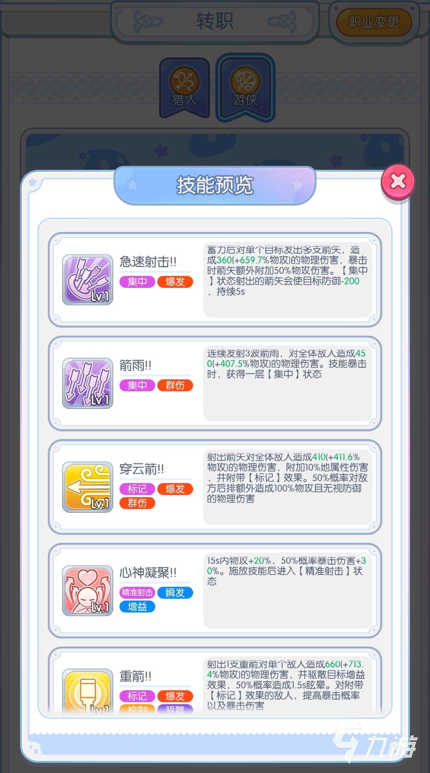 而轉(zhuǎn)職成為游俠之后,技能并沒(méi)有特別大的改變,穿云箭,心神凝聚重劍,破空連擊,基本上就是將弓箭手的技能進(jìn)行了一些強(qiáng)化,春云箭可以對(duì)敵方單體造成傷害,并且驅(qū)散目標(biāo)的增益效果,造成眩暈,如果敵方被標(biāo)記的話,可以百分百造成暴擊。心神凝聚這個(gè)技能就比較變態(tài)了,可以使自己的技能傷害以及普攻全部不用瞄準(zhǔn),直接命中。而破空連擊就是在二連擊的狀態(tài)下強(qiáng)化成了三連擊。