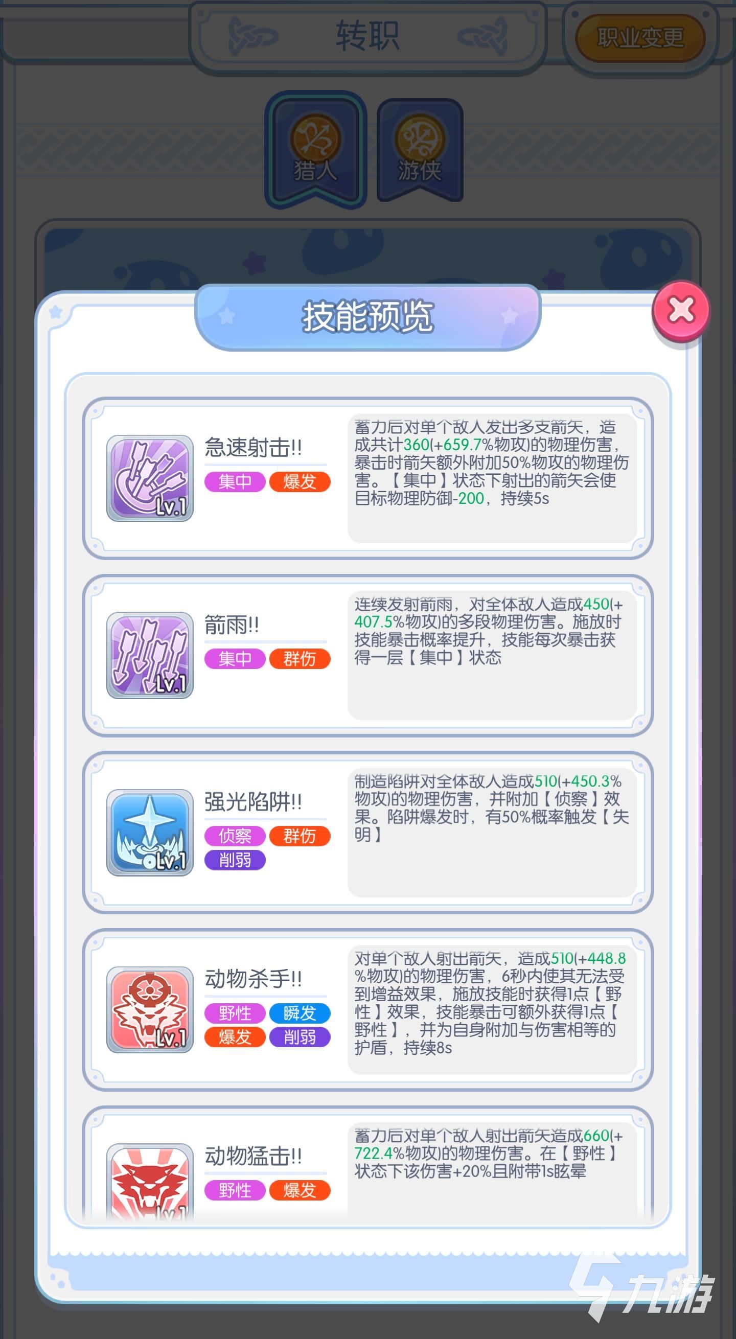 獵人的技能在轉(zhuǎn)職之后發(fā)生了質(zhì)的改變,不僅是強(qiáng)光陷阱,動(dòng)物殺手,動(dòng)物猛擊,還是馴鷹術(shù),陷阱可以控制住敵方,并且削弱敵方的傷害,動(dòng)物殺手也可以削弱敵方的傷害,并且可以瞬間造成極強(qiáng)的野性效果,動(dòng)物猛擊可以進(jìn)入野性狀態(tài),攻速雖然減慢,但是他的傷害以及基礎(chǔ)暴擊率都會(huì)額外提高,馴鷹術(shù)可以保留著弓箭手的特色,還有偵察能力。