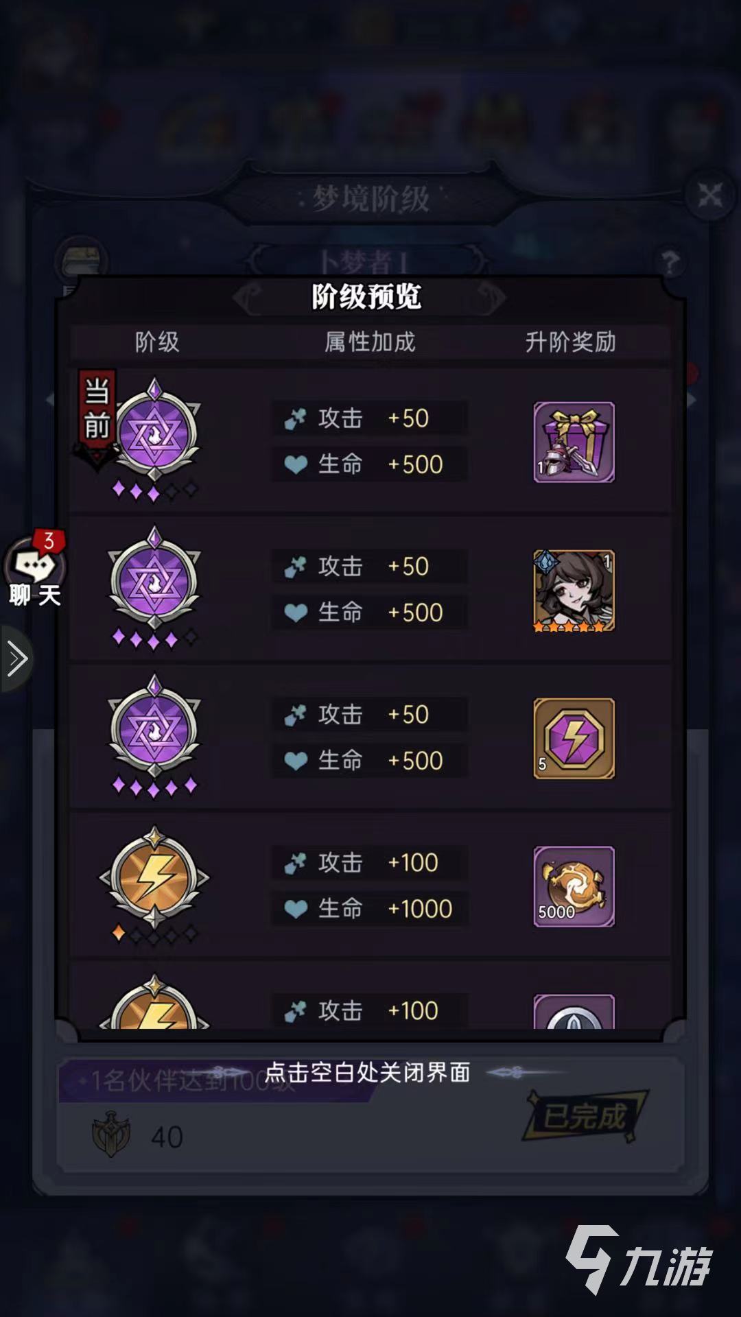 當(dāng)玩家處于尋夢者V通過完成冒險第90關(guān),奇境探險戰(zhàn)斗勝利5次和進(jìn)行一次快速探險活動后。收集夢境勛章,激活階級特權(quán)可以激活成為卜夢者。當(dāng)成為卜夢者后,冒險金幣收益增加5%,無盡試煉援助獎勵翻倍,周常第3檔獎勵增加重生魔石一個。