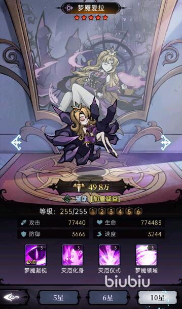 第三名輔助角色為夢魘愛拉,該角色的戰(zhàn)斗特性為加盾減益。戰(zhàn)斗當中可以為隊友們施加上免傷護盾,讓敵人的進攻效率變得更低。并且夢魘愛拉在發(fā)動進攻的時候,還會直接對敵人附加上各種建議效果,導致敵人的整體輸出能力下降。