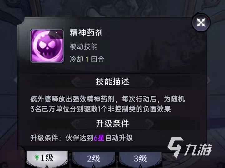 四技能精神藥劑,該技能是一個(gè)被動(dòng)技能,在釋放之后可以在每次行動(dòng)后為隨機(jī)三名友方單位分別驅(qū)散一個(gè)非控制類的負(fù)面效果,該技能的冷卻時(shí)間為一回合,當(dāng)玩家升到六星之后自動(dòng)開啟。