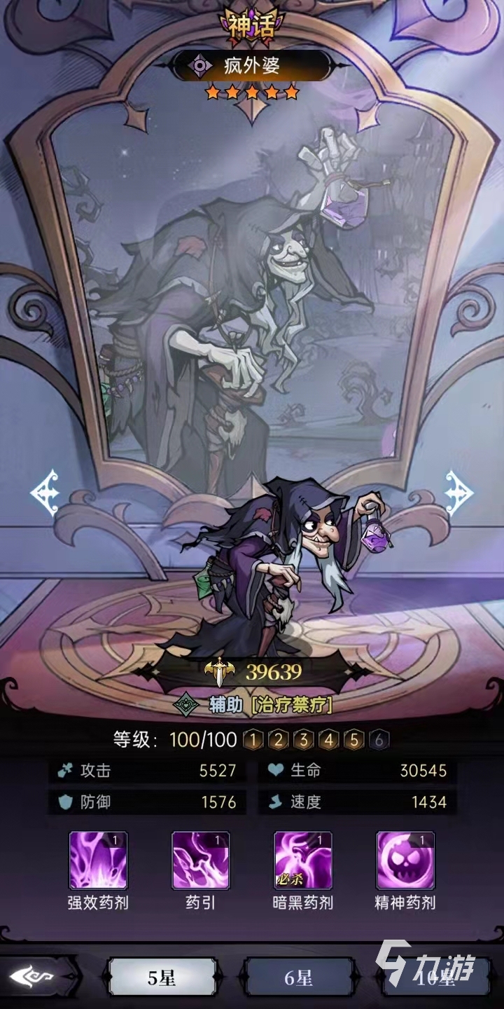 三技能暗黑藥劑,該技能屬于一個(gè)必殺技,是瘋外婆的群體輸出技能,在釋放之后可對(duì)敵方全體成員分別造成92%的法術(shù)傷害,并且對(duì)敵方前排施加禁療,這個(gè)禁療可以讓敵方角色無法被治療。