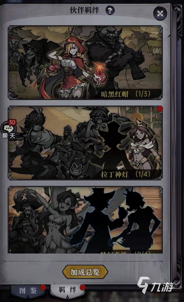 伙伴羈絆玩法是游戲內一個比較特殊的存在,游戲內的每一個角色都是有不同的陣營,當玩家集齊該陣營內的所有伙伴即可解鎖對應的屬性加成,該玩法主要存在于伙伴的圖鑒界面。圖鑒里面會有兩個選項,第一個是伙伴圖鑒,第二個則是伙伴羈絆,玩家可在這其中查看游戲內的所有羈絆陣營。