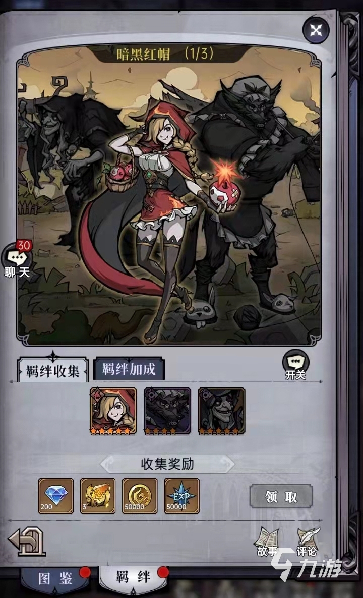 其次,比較被大家關注的屬性加成還有暗黑紅帽,里面對應的三個人物分別是布蘭妮,瘋外婆以及狼人。玩家可通過集齊以上的三個人物,然后在暗黑紅帽的羈絆玩法內領取對應的羈絆伙伴加成。