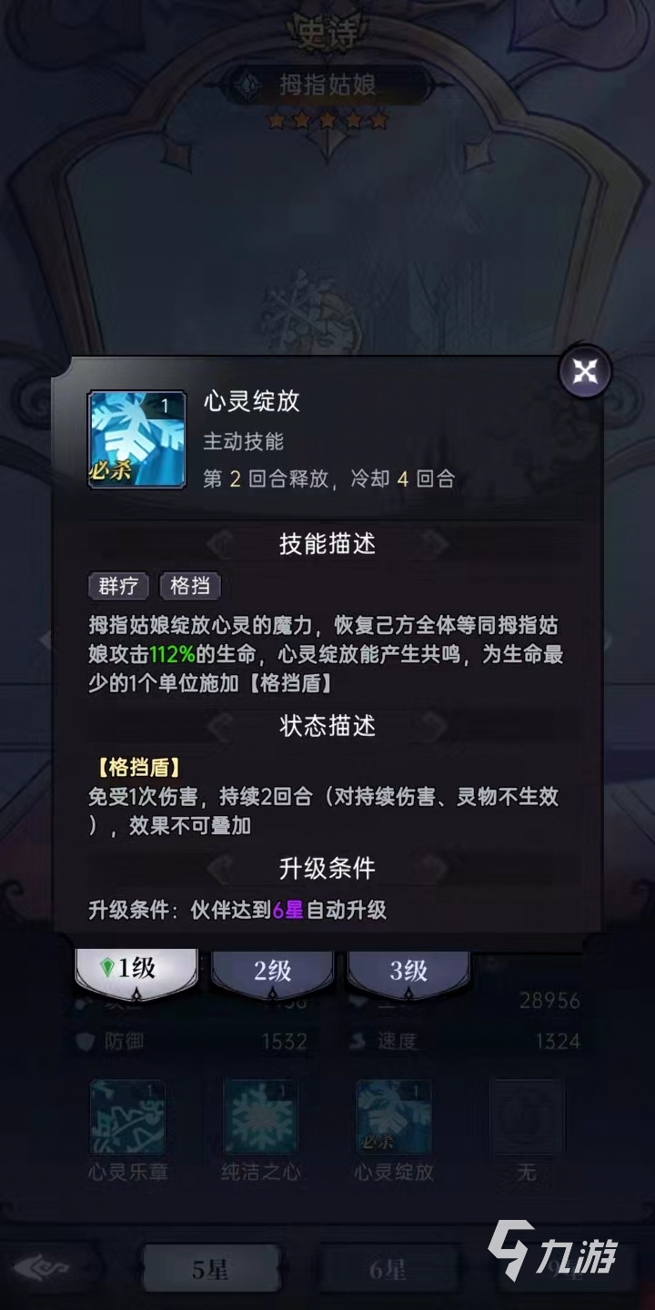 他的最后一個(gè)技能為心靈綻放,屬于一個(gè)群體治療技能,拇指姑娘綻放心靈的魔力,可以為友方全體成員恢復(fù)拇指姑娘攻擊112%的生命,并且還能為生命最低的一個(gè)隊(duì)友施加格擋盾,這個(gè)格擋盾可以使其免疫一次傷害。這一技能可以說也是拇指姑娘最實(shí)用的技能了,既可以幫助隊(duì)友恢復(fù)血量,又帶有一定的防御能力,一次的免疫傷害對于輸出角色來說可是非常實(shí)用的,這就相當(dāng)于多了一條命一樣。