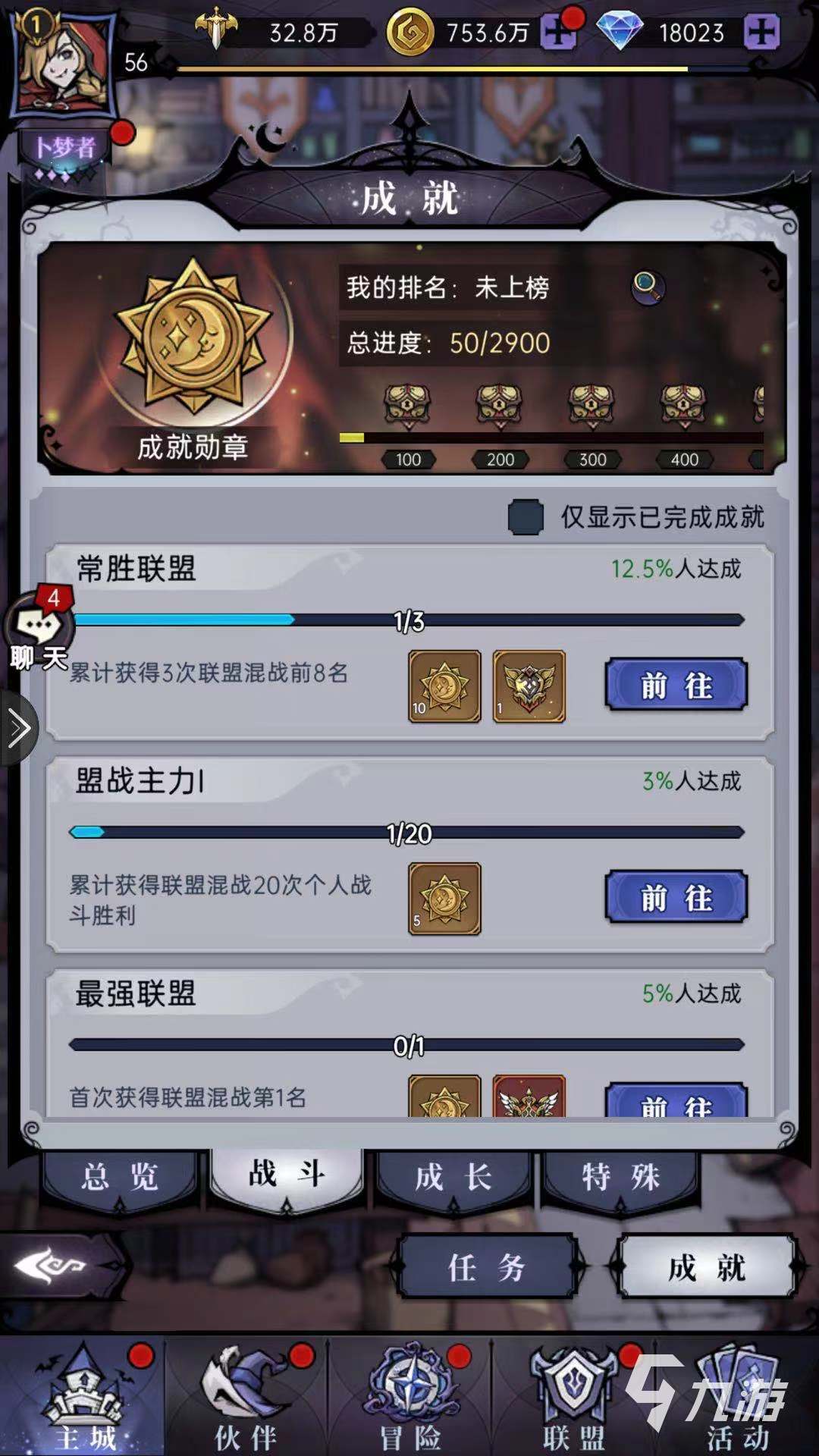 在成就等級活動中玩家通過參與成就中不同的活動任務(wù),當(dāng)完成任務(wù)后,可以獲得相應(yīng)的道具獎勵,包括常勝聯(lián)盟,成就勛章等,當(dāng)成就勛章積累到一定值時,可以獲得皮膚碎片或鉆石道具。