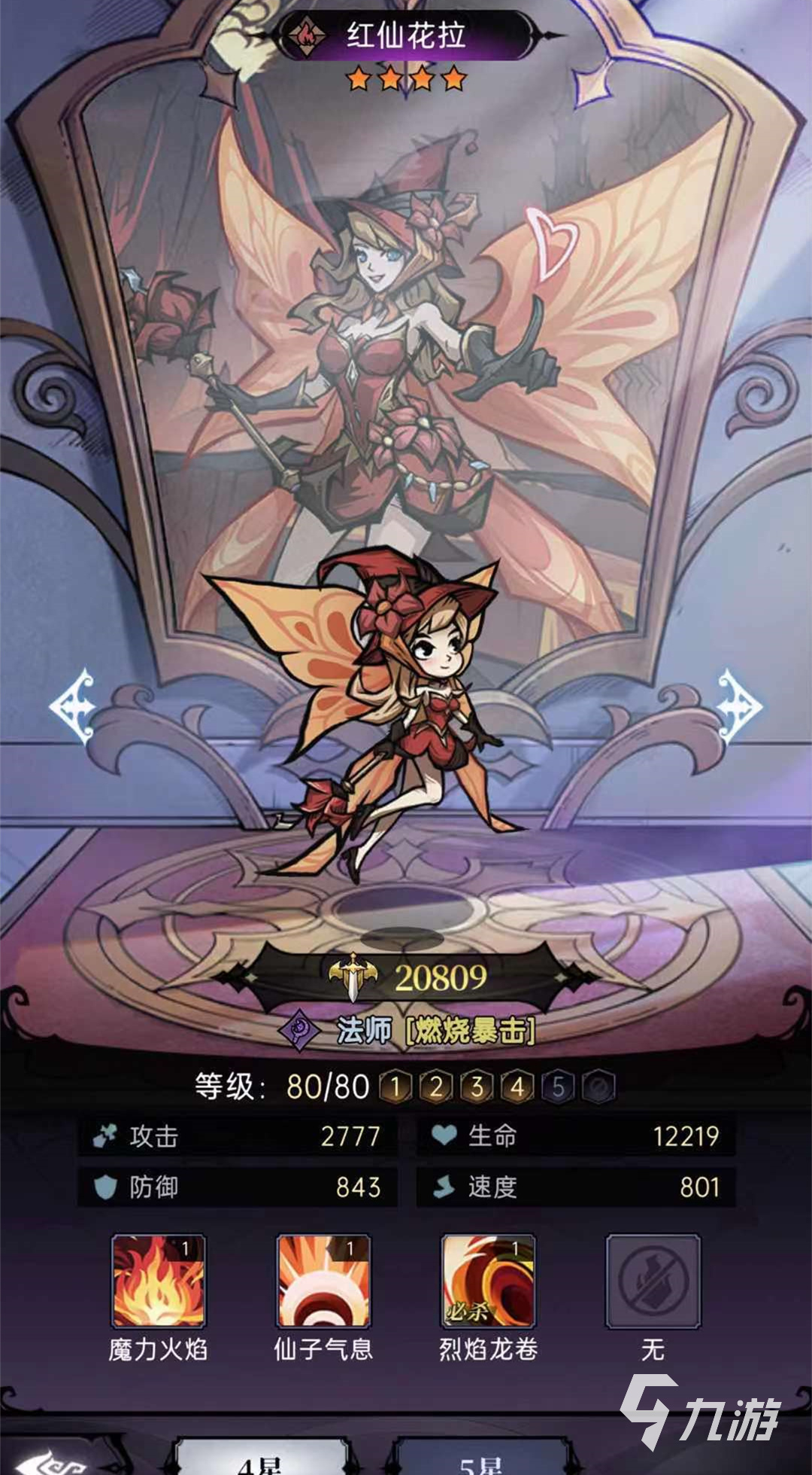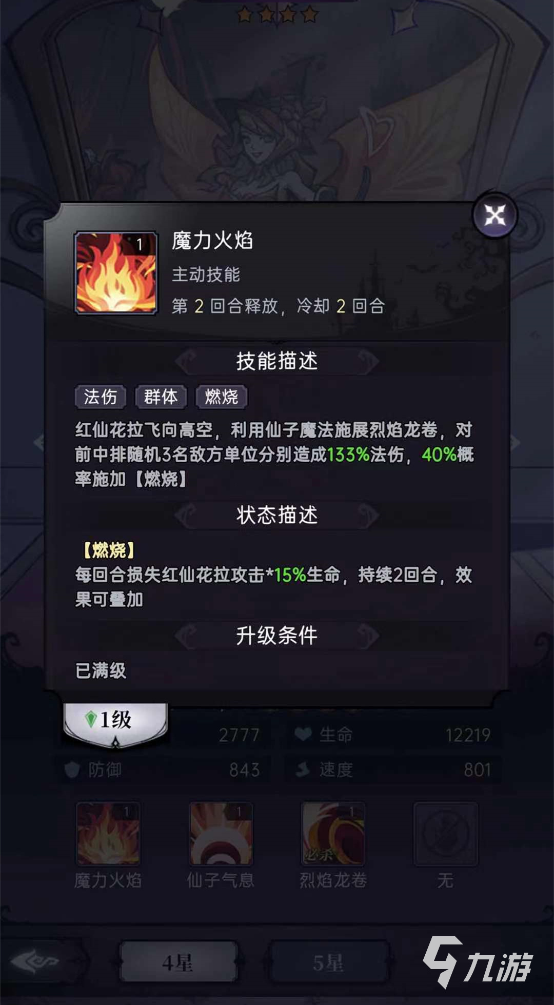 在技能方面也是非常不錯(cuò)的,屬于火系法師,目前有3種技能,第1種是魔力火焰,當(dāng)在對(duì)劇中紅仙花拉開啟大招時(shí),會(huì)飛向高空,利用仙子魔法施展烈焰龍卷,對(duì)前排中排隨機(jī)3名敵方單位分別造成133%法傷,40%概率施加燃燒技能。