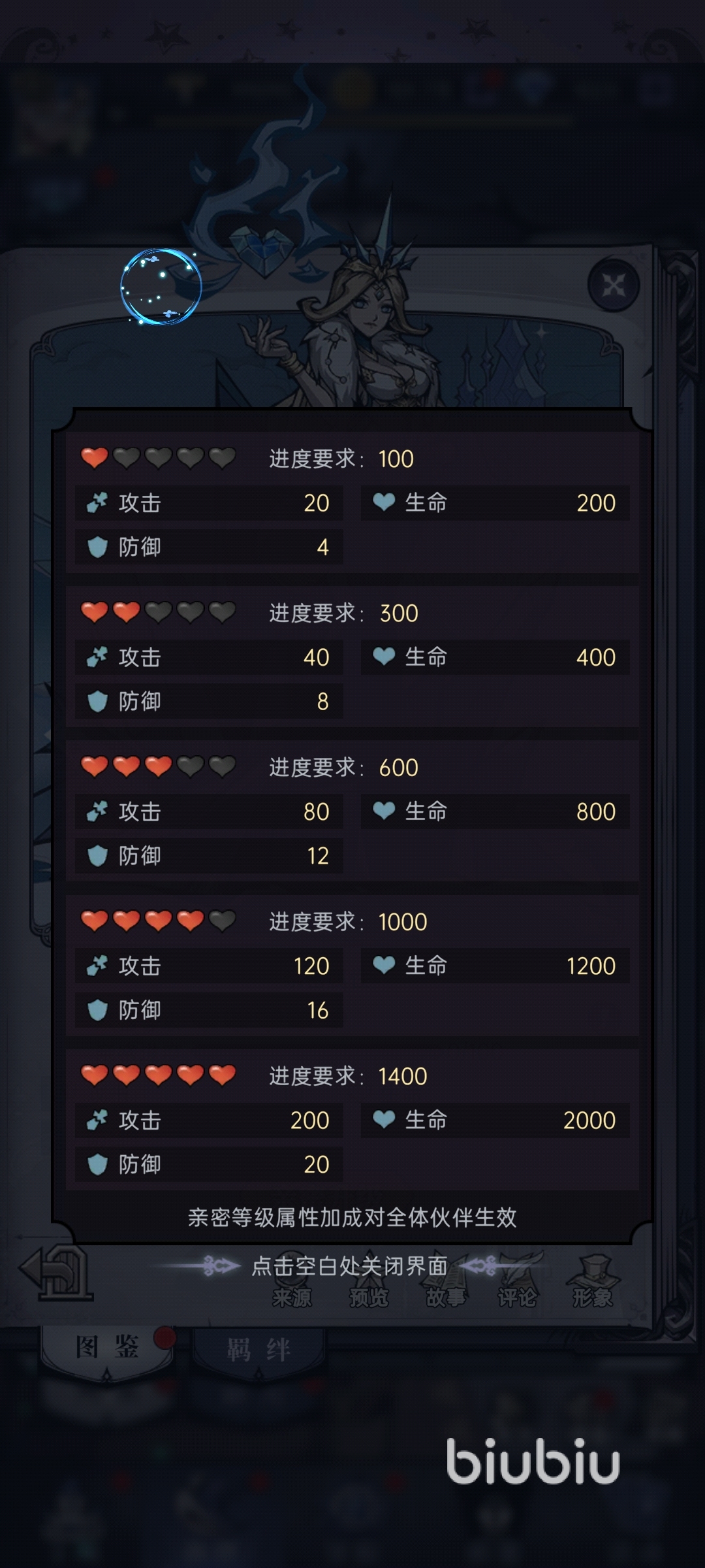 好感度戰(zhàn)力加成:我們的好感度一共可以提高五級(jí),每次提高都會(huì)為我們的伙伴帶來:攻擊、防御和生命值的加成,因此玩家們務(wù)必重視好感度的提升。