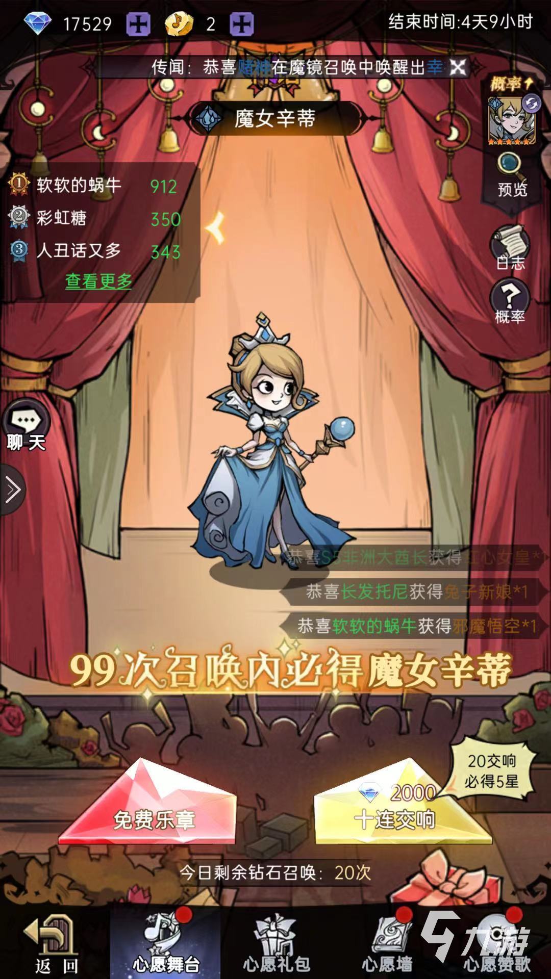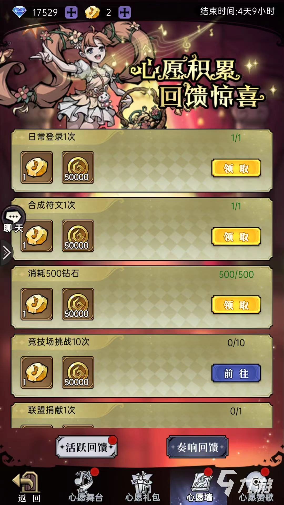 在心愿舞臺中,玩家通過消耗鉆石進(jìn)行抽取隨機(jī)出現(xiàn)的伙伴,有一定幾率可以得到心儀伙伴。每日可以通過鉆石召喚20次,在心愿禮包中。玩家可以通過現(xiàn)金購買心愿禮包,獲得各種不同的道具獎勵。在心愿墻中,可以看到包括多種任務(wù)。當(dāng)完成相應(yīng)任務(wù)后,可以進(jìn)行領(lǐng)取道具獎勵,比如當(dāng)合成一次符文后可以獲得一個心愿符音道具和金幣道具。