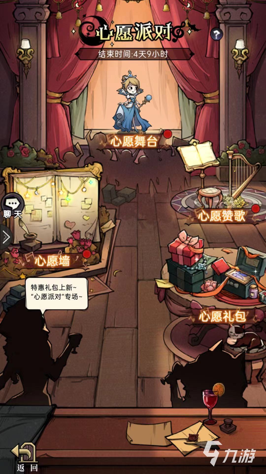 玩家進(jìn)入游戲后,可以看到主頁面中包括心愿派對,選擇心愿派對活動進(jìn)入,頁面中包含心愿舞臺,心愿墻,心愿贊歌,心愿禮包等任務(wù)。在心愿舞臺上心愿嘉賓神秘降臨,伴隨著心愿音符奏響夢幻旋律,將驚喜裝滿每個玩家的心。