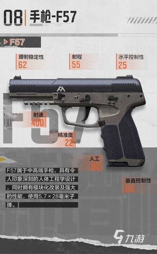 至于有什么出彩的地方,我們來(lái)看具體數(shù)據(jù)。后坐力方面,25水平,60垂直,看起來(lái)不怎么樣但是實(shí)際的用起來(lái)是相當(dāng)?shù)牟诲e(cuò)。其高達(dá)81的人機(jī)和55的殺傷射程在一眾手槍中也是頂級(jí)的存在,精準(zhǔn)22與62的腰射對(duì)于它影響不大。讓它最出彩的則是高強(qiáng)度的改裝,和適配的子彈。