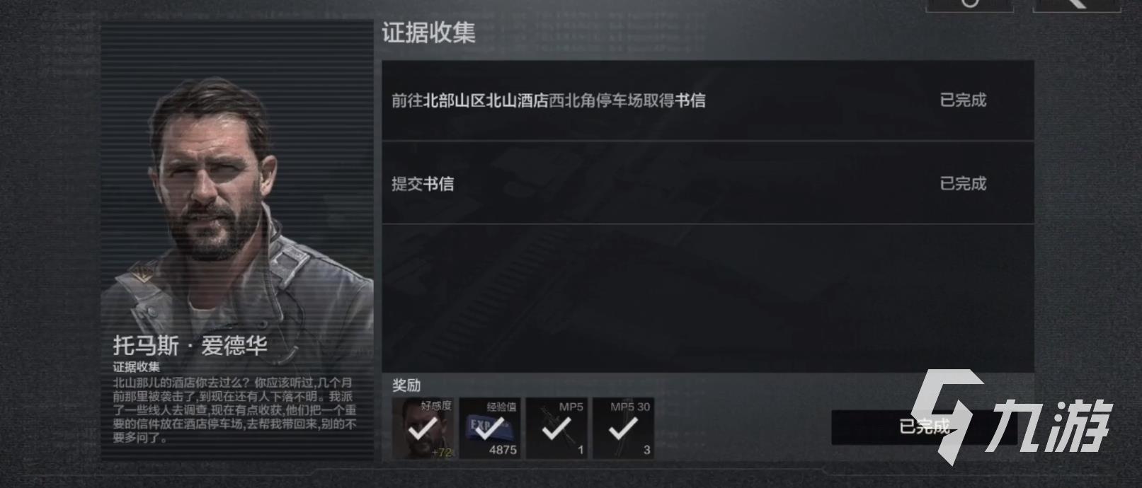 小伙伴們打開這個(gè)任務(wù),可以看到一共有兩個(gè)環(huán)節(jié),其一是需要去北山酒店,來到其西北方向的停車場(chǎng),拿到書信;其二是需要將拿到的書信交付給托馬斯,如此就可以完成這個(gè)任務(wù)了。