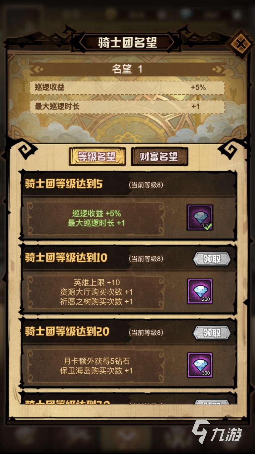 首先,等級(jí)名望和財(cái)富名望加起來(lái),就是你的騎士名望,那么要兩個(gè)一起升級(jí),才能快速的升級(jí)你的騎士名望。騎士團(tuán)的名望可以通過(guò)提升騎士團(tuán)等級(jí)或者是氪金來(lái)進(jìn)行提升,名望最多升到十級(jí),每一級(jí)都有相應(yīng)的獎(jiǎng)勵(lì)哦。