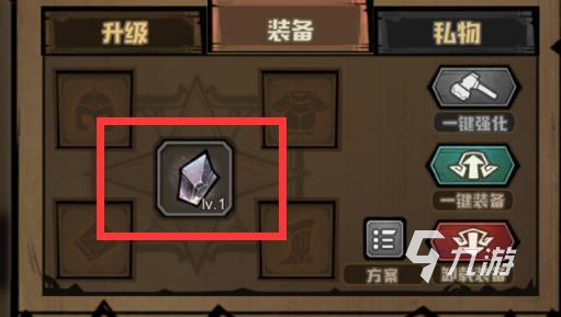 2、解鎖后玩家可以進(jìn)入角色裝備界面,四個(gè)裝備里面最中心的就是升級(jí)的位置,點(diǎn)擊中間按鈕即可升級(jí),大家可以在此進(jìn)行操作升級(jí)。
