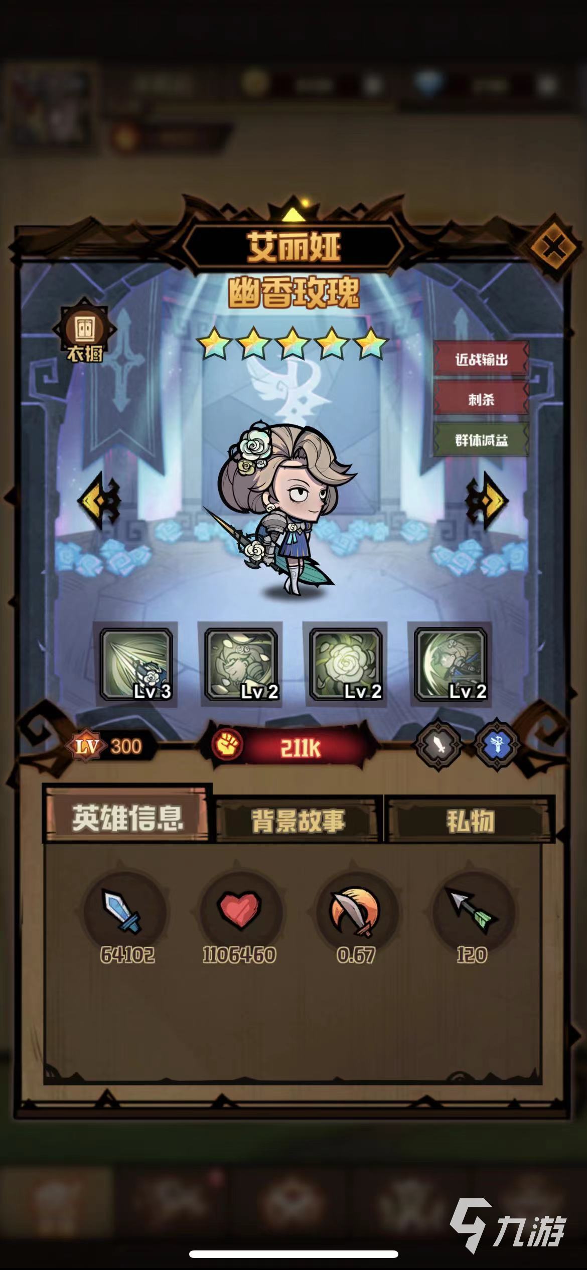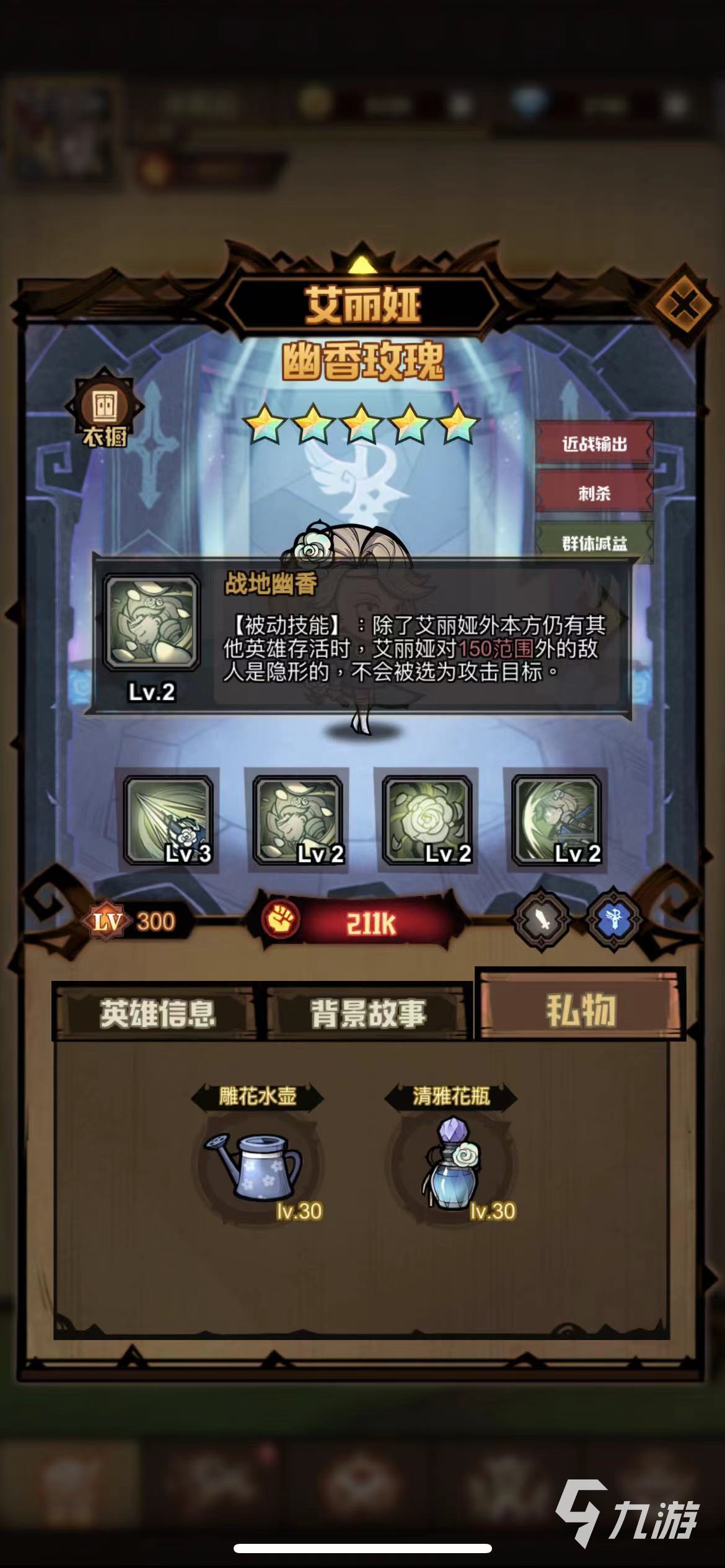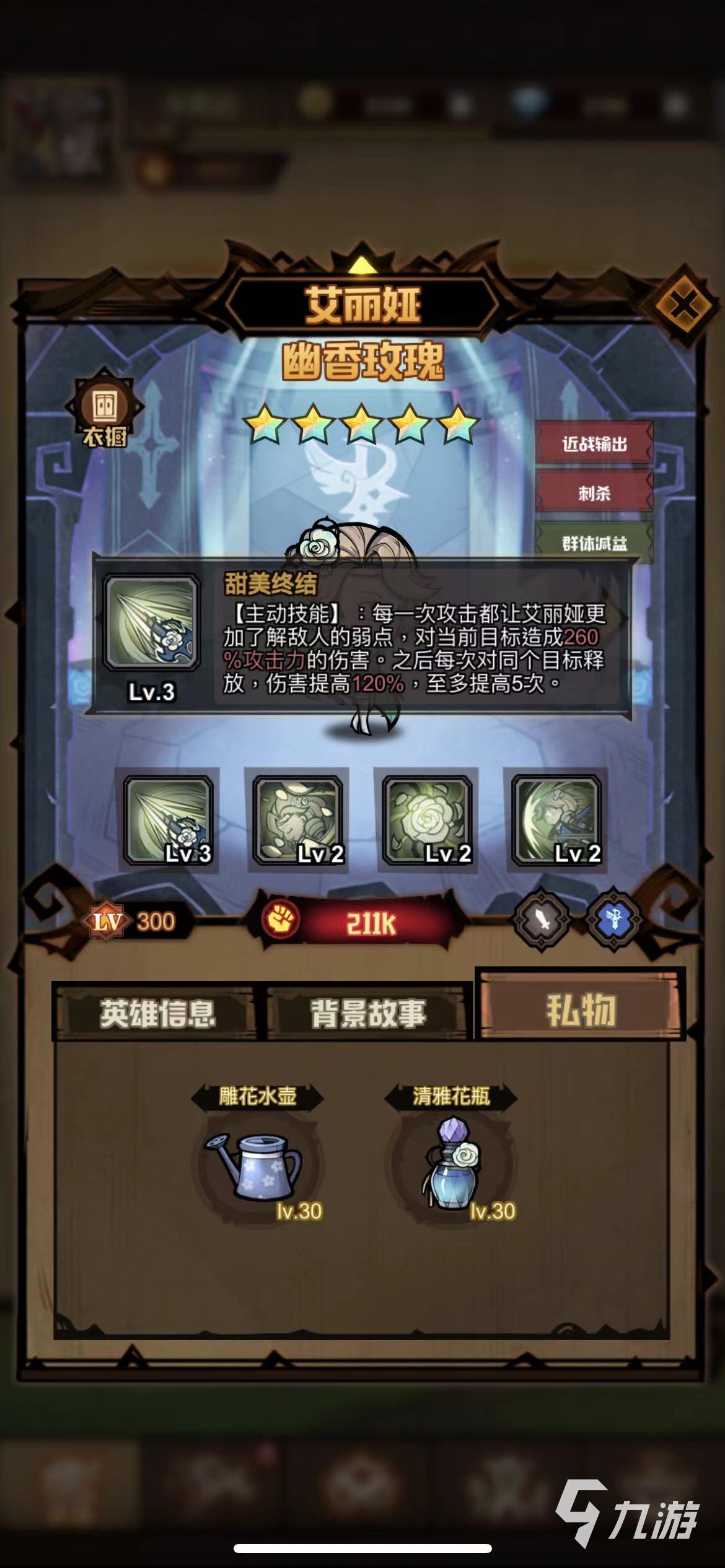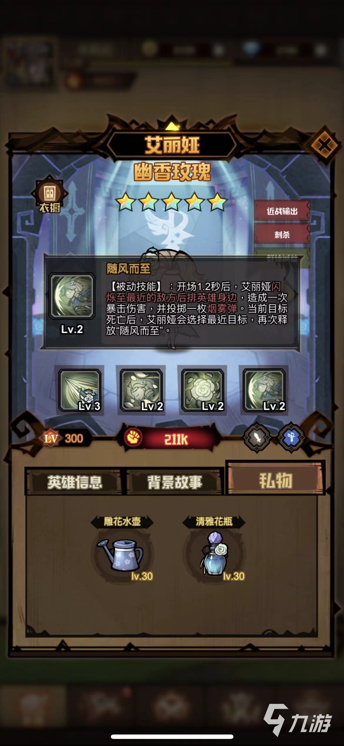 艾麗婭是傳說級人物,她是近戰(zhàn)輸出、刺殺型選手,也會給隊伍帶來群體減益的效果,她最常說的一句話就是,優(yōu)雅從不過時,她的背景故事是敵人的死狀更像是進入了一場甜美但不再醒來的夢,她的私物是雕花水壺和清雅花瓶,每一個私物都會給她進行屬性加成。
